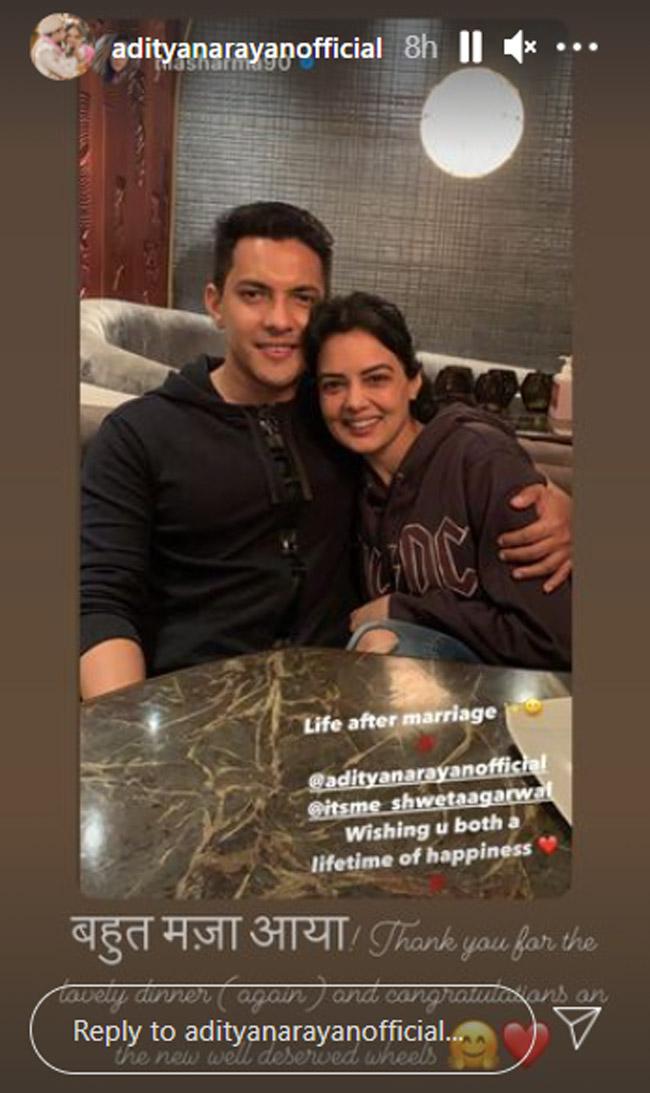 निया शर्मा ने अपने घर में डिनर पर आदित्य और श्वेता को बुलाया था. इस डिनर प्रोग्राम से आदित्य और उनकी पत्नी श्वेता की फोटो शेयर कर निया ने लिखा- 'शादी के बाद जिंदगी...आप दोनों की जिंदगी खुशियों से भरी रहे'. वहीं आदित्य ने भी इस फोटो को अपने इंस्टा स्टोरी पर शेयर कर निया को डिनर के लिए धन्यवाद दिया है. वे लिखते हैं- 'बहुत मजा आया... शानदार डिनर के लिए धन्यवाद (दोबारा) और अपनी डिजर्विंग नई कार के लिए बधाई'.