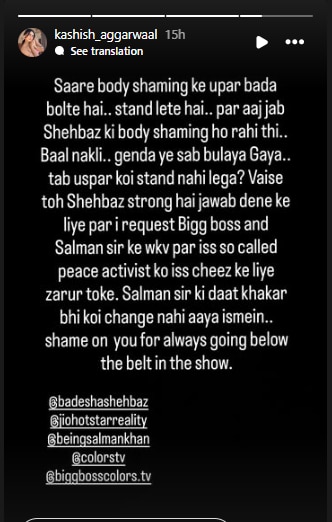 कशिश ने लिखा- “हर कोई बॉडी शेमिंग के खिलाफ बोलता है, लेकिन जब यही चीज बिग बॉस के घर में होती है, तो कोई कुछ नहीं कहता. आज शहबाज को अपमानित किया गया, और किसी ने उनका साथ नहीं दिया. मैं बिग बॉस और सलमान सर से अनुरोध करती हूं कि इस तरह की हरकत करने वालों को वीकेंड का वार में जरूर टोका जाए.”