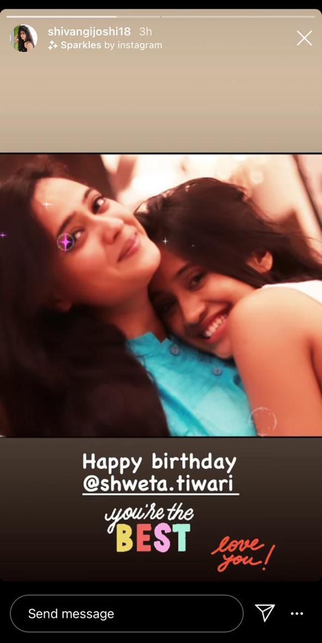 टीवी के तमाम स्टार्स श्वेता को जन्मदिन की शुभकामनाएं दे रहे हैं. ऐसे में शिवांगी जोशी ने भी अपनी फेवरेट को-स्टार को जन्मदिन विश करते हुए उन्हें बेस्ट बताया. शिवांगी ने श्वेता के साथ एक बेहद प्यारी फोटो शेयर करते हुए लिखा- हैप्पी बर्थडे. आप बेस्ट हो. लव यू.