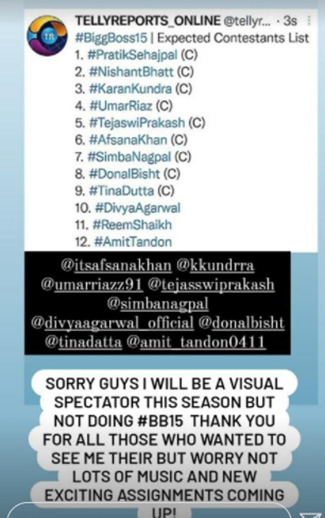 अमित टंडन ने इंस्टा स्टोरी एक वायरल लिस्ट शेयर की है जिसमें बिग बॉस 15 में पार्टिसिपेट करने वाले कंट्स्टेंट्स के नाम शामिल हैं. उसमें अमित टंडन का नाम भी शामिल है. अपनी इस पोस्ट में अमित टंडन ने लिखा- सॉरी दोस्तों, इस सीजन मैं बिग बॉस को सिर्फ देखने वाला हूं, मैं शो नहीं कर रहा है. उन सभी का शुक्रिया जो मुझे शो में देखना चाहते हैं. चिंता ना करें मेरे कई सारे गाने और नए एक्साइटिंग प्रोजेक्ट पाइपलाइन में हैं.