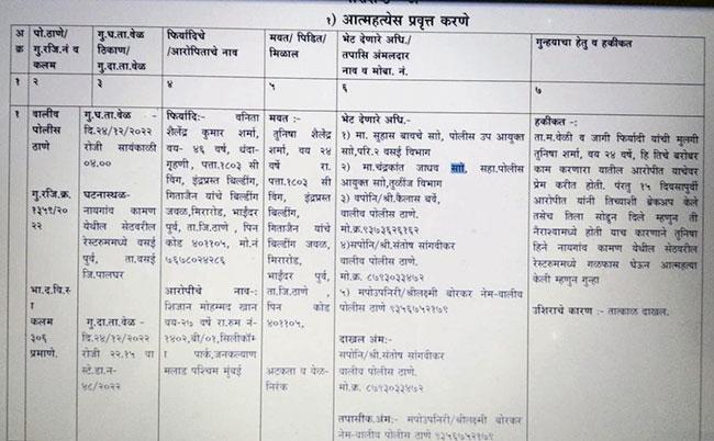तुनिशा शर्मा के सुसाइड की खबरें सामने आने के बाद से ही पुलिस एक्शन मोड में है. पुलिस मामले की जांच कर रही है. अब तुनिशा शर्मा के सुसाइड केस की FIR कॉपी सामने आई है. FIR कॉपी के जरिए एक्ट्रेस के सुसाइड केस में बड़ा बड़ा खुलासा हुआ है.