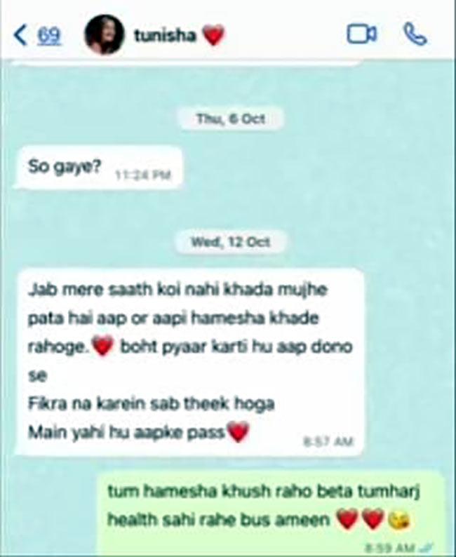 फिर 6 दिनों बाद 12 अक्टूबर को तुनिशा ने दोबारा शीजान की मां को मैसेज किया. तुनिशा ने अपने मैसेज में लिखा था- जब मेरे साथ कोई नहीं खड़ा मुझे पता है आप और आपी (फलक नाज) हमेशा खड़े रहोगे. बहुत प्यार करती हूं आप दोनों से, फिक्र न करें सब ठीक होगा, मैं यही हूं आपके पास...तुनिशा के इस मैसेज के जवाब में शीजान की मां ने लिखा था- तुम हमेशा खुश रहो बेटा, तुम्हारी हेल्थ सही रहे बस आमीन.