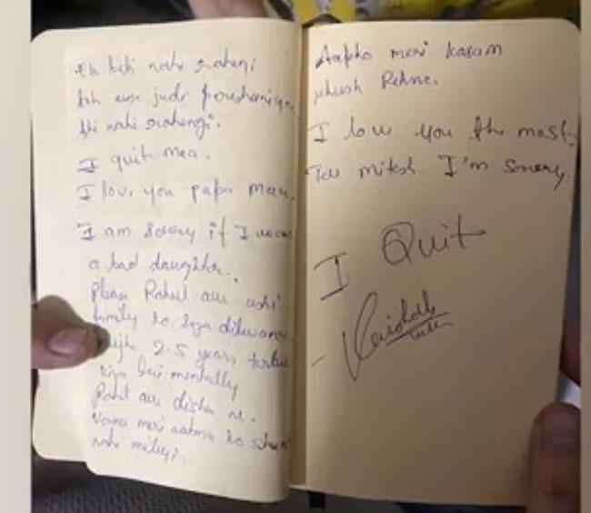 वैशाली ने सुसाइड नोट में अपने पड़ोसी राहुल और उसकी पत्नी दिशा का नाम लिखा था. दोनों को अपनी मौत का जिम्मेदार बताया और उन्हें सजा दिलवाने की मांग की. वैशाली के सुसाइड नोट में आखिरी शब्द थे I Quit. वैशाली की मितेश से शादी होने वाली थी, सुसाइड नोट में वैशाली ने मितेश से भी माफी मांगी.