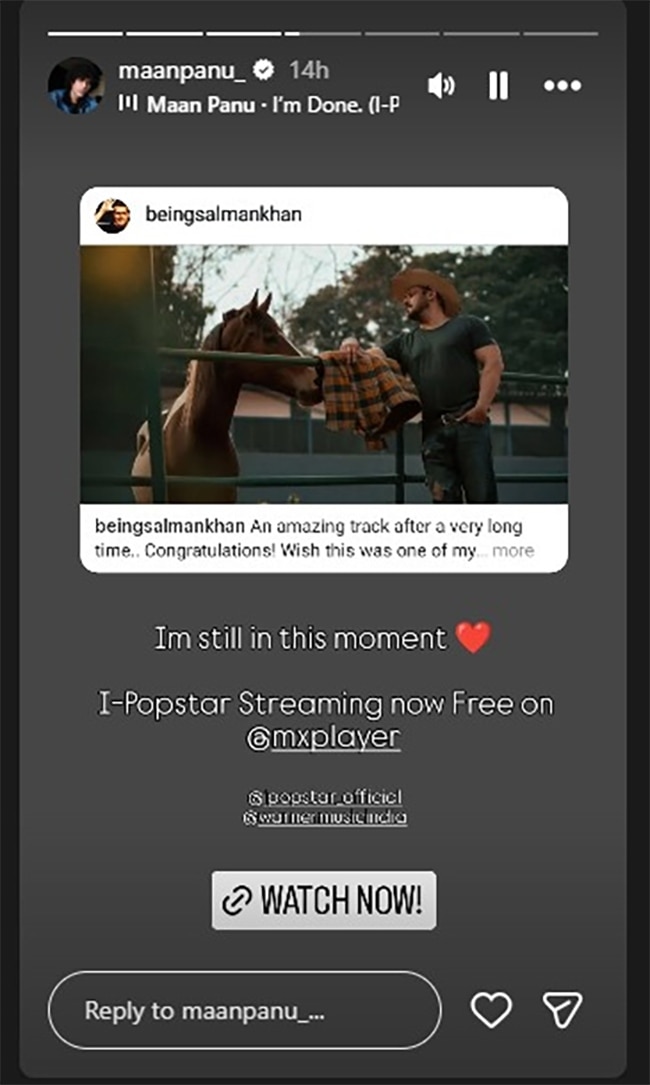 सिर्फ फैंस ही नहीं, बल्कि बॉलीवुड के स्टार सलमान खान भी मान के I'm Done गाने के मुरीद हो गए हैं. इस गाने ने सलमान के दिल को भी जीत लिया. सलमान खान ने अपनी एक फोटो के साथ I'm Done सॉन्ग शेयर किया. पोस्ट के कैप्शन में सलमान ने इस गाने की जमकर सराहना की.