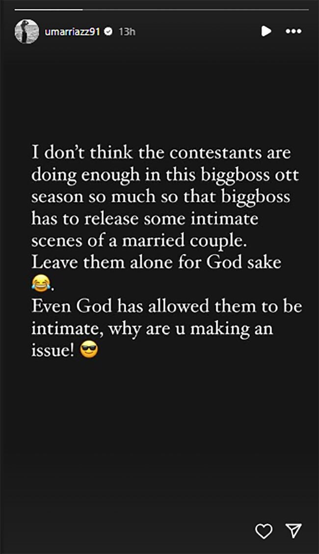 बिग बॉस के एक्स कंटेस्टेंट उमर रियाज ने भी अरमान के इंटीमेट वीडियो पर चुटकी ली है. इंस्टा स्टोरी में उमर ने लिखा- मुझे नहीं लगता बिग बॉस ओटीटी के कंटेस्टेंट्स कुछ खास कर पा रहे हैं तभी तो बिग बॉस को मैरिड कपल का इंटीमेट वीडियो रिलीज करना पड़ा. भगवान के लिए उन्हें अकेला छोड़ दो. भगवान ने भी उन्हें इंटीमेट होना अलाउ कर रखा है. तो आप क्यों इश्यू बना रहे हो.