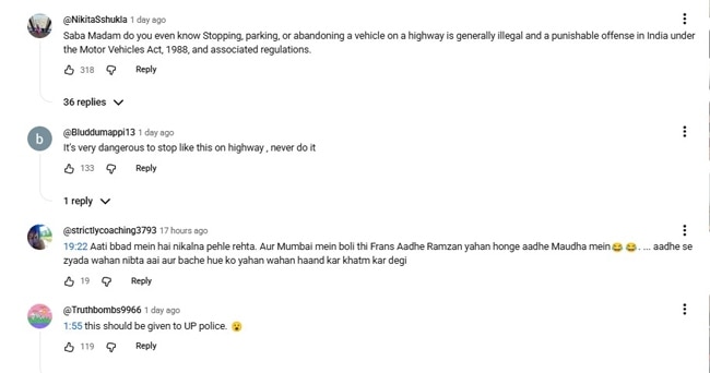 लोगों का कहना है कि यह खतरनाक होने के साथ हाईवे के नियमों का उल्लंघन भी है. लोग सबा और खालिद से पूछ रहे हैं कि अगर चलती हुई सड़क पर कोई दुर्घटना हो जाती, तो कौन जिम्मेदार होता? लोग उनपर सुरक्षा नियमों की अनदेखी करने का आरोप भी लगा रहे हैं. लोगों का कहना है कि हाईवे पर इस तरह सड़क के किनारे बैठना न केवल उनके परिवार के लिए, बल्कि दूसरे लोगों के लिए भी खतरनाक हो सकता है. कई लोग ये भी कह रहे हैं कि सबा के इस वीडियो को यूपी पुलिस को दिखाना चाहिए. वैसे आपकी क्या राय है?