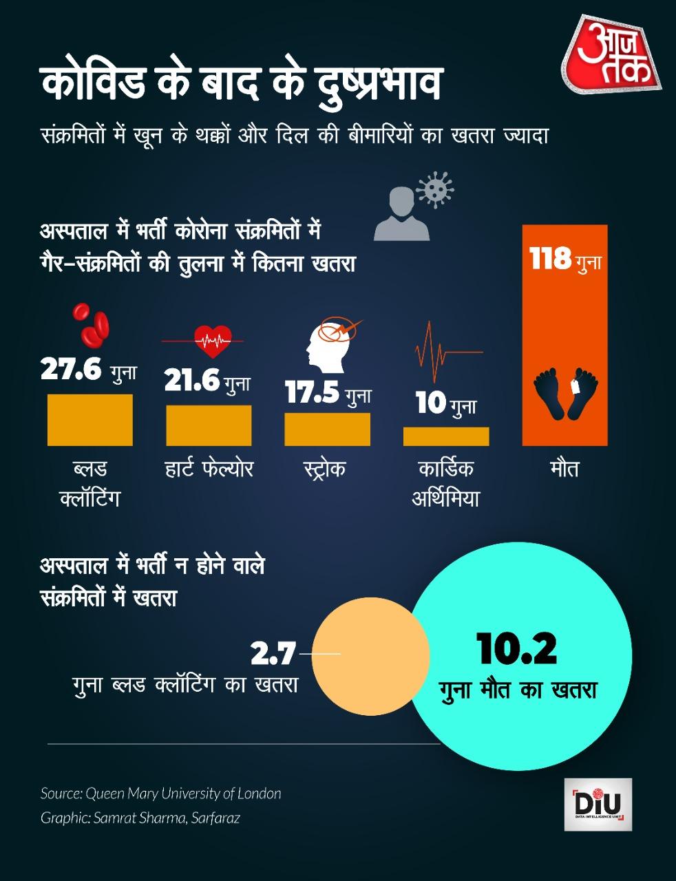- अस्पताल में भर्ती होने वाले कोरोना मरीजों में गैर-संक्रमितों की तुलना में ब्लड क्लॉटिंग का 27.6 गुना, हार्ट फेल्योर का 21.6 गुना, स्ट्रोक का 17.5 और कार्डिक अर्थिमिया का 10 गुना खतरा ज्यादा रहता है. इतना ही नहीं, ऐसे कोरोना मरीजों में मौत का खतरा भी गैर-संक्रमितों के मुकाबले 118 गुना ज्यादा होता है.
