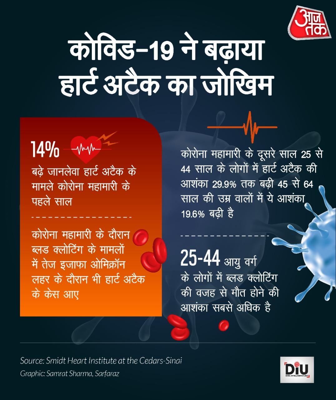 अब अगर क्वींस मैरी यूनिवर्सिटी की स्टडी ने चिंता बढ़ाई है, दूसरी तरफ कैलिफोर्निया के Smidt Heart Institute ने भी इसी विषय पर एक स्टडी की है. उस स्टडी में ये बात सामने आई है कि कोरोना की वजह से हार्ट अटैक का खतरा ज्यादा बढ़ गया है. रिसर्च के मुताबिक 24 से 44 एज ग्रुप के लोगों में हार्ट अटैक का खतरा ज्यादा देखा गया है. आंकड़ा तो ये भी है कि कोरोना काल से पहले हार्ट अटैक मौत होने वाले लोगों की संख्या 1.44 लाख रही थी, लेकिन कोरोना काल में ये आंकड़ा 1.64 लाख पहुंच गया, यानी कि सीधे-सीधे 14 प्रतिशत की वृद्धि हुई.