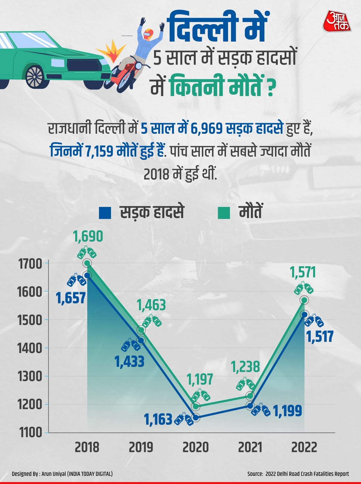 'दिल्ली रोड क्रैश फैटलिटीज' नाम से आई इस रिपोर्ट में 2022 तक के आंकड़े दिए गए हैं. इसमें बताया गया है कि 2022 में राजधानी दिल्ली में 1,517 जानलेवा सड़क हादसे हुए थे, जिनमें 1,571 लोगों की मौत हो गई थी. यानी, औसतन हर दिन 4 लोगों की मौत सड़क हादसों में हो रही है.