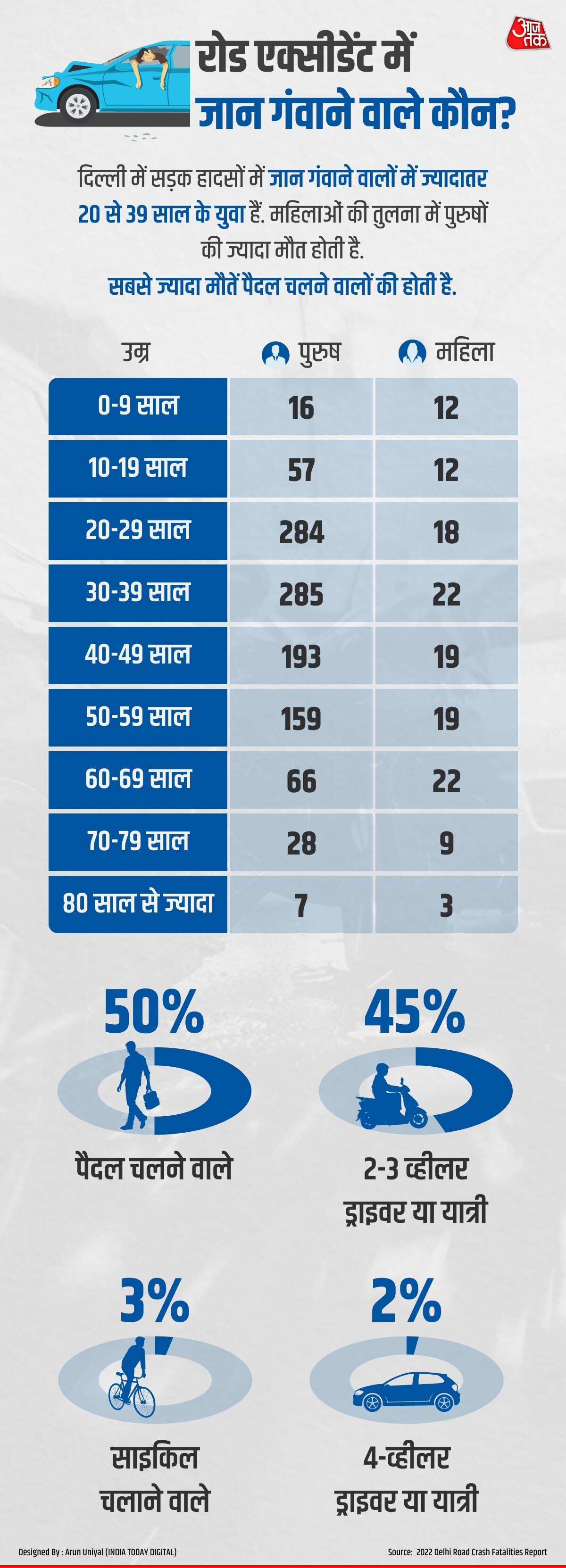 रिपोर्ट के मुताबिक, सड़क हादसों में जान गंवाने वाले ज्यादातर 20 से 39 साल की उम्र के होते हैं. 2022 में दिल्ली में जितनी मौतें हुईं, उनमें से 609 की उम्र 20 से 39 साल के बीच थी.