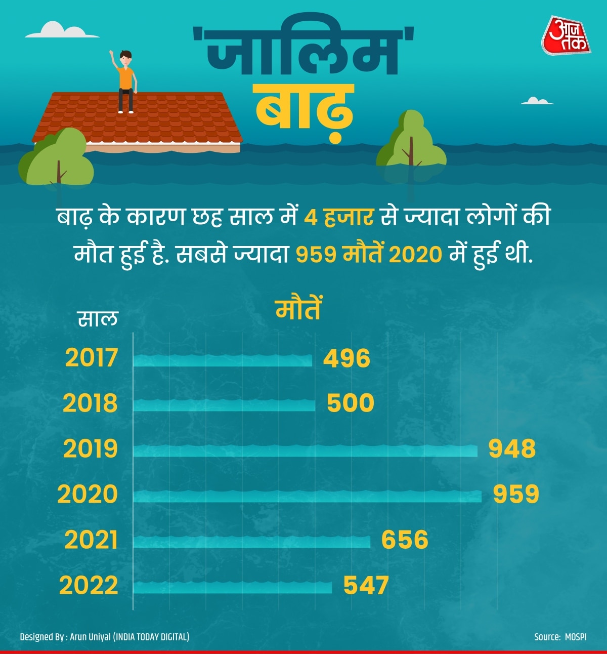संयुक्त राष्ट्र के मुताबिक, 2011 से 2020 तक बाढ़ की वजह से हर साल औसतन 15सौ भारतीयों की मौत हुई है. हालांकि, सरकारी आंकड़े इससे थोड़े अलग हैं. सरकारी आंकड़ों के मुताबिक, 2017 से 2022 के बीच छह साल में बाढ़ ने 4,106 लोगों की जान ली है. यानी, हर साल औसतन 684 लोगों की मौत हुई.