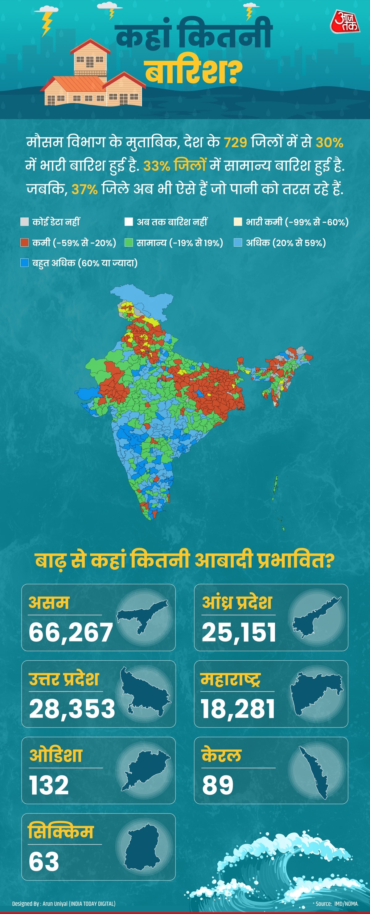 मौसम विभाग के मुताबिक, देशभर के 729 जिलों में से 214 यानी 30% जिले ऐसे हैं, जहां बहुत जमकर बारिश हुई है. जबकि, 237 यानी 33% जिलों में सामान्य बारिश हो चुकी है. लेकिन 279 यानी 37% जिले ऐसे भी हैं जहां अब तक बहुत कम बारिश हुई है. इनमें ज्यादातर यूपी, बिहार, झारखंड और बंगाल जैसे राज्य हैं.