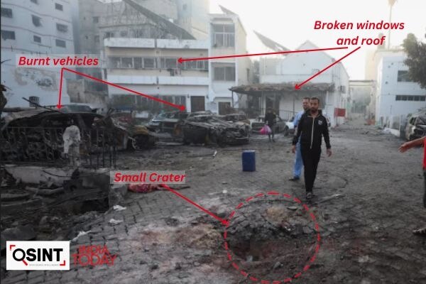एक्सपर्ट के मुताबिक, अस्पताल परिसर में जिस जगह विस्फोट हुआ, वहां एक गड्ढा हो गया है. उसके आसपास टूटी हुई खिड़कियां, जली हुई गाड़ियां और क्षतिग्रस्त छतें दिख रहीं हैं.