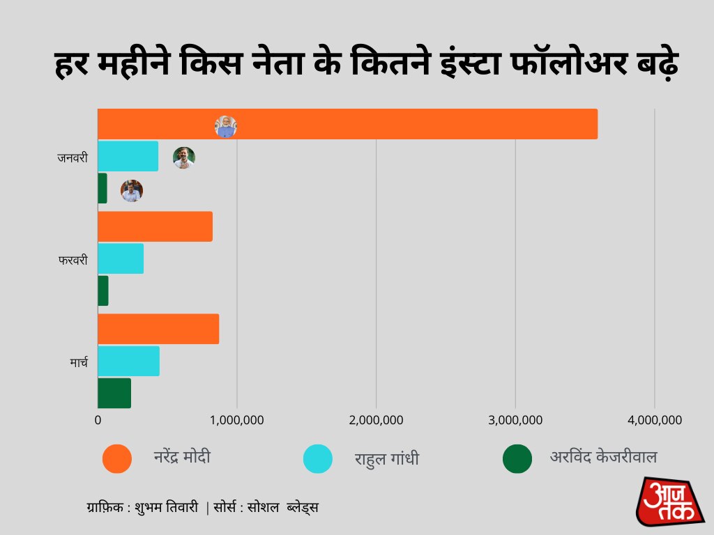 इंस्टाग्राम पर पीएम मोदी को लगभग 8.8 करोड़ यूजर्स फॉलो करते हैं. जनवरी से मार्च के बीच उनके 52 लाख फॉलोअर्स और बढ़ गए. इसी दौरान राहुल गांधी को फॉलो करने वालों की संख्या 12 लाख और केजरीवाल के फॉलोअर्स की संख्या में 3 लाख की बढ़ोतरी हुई.