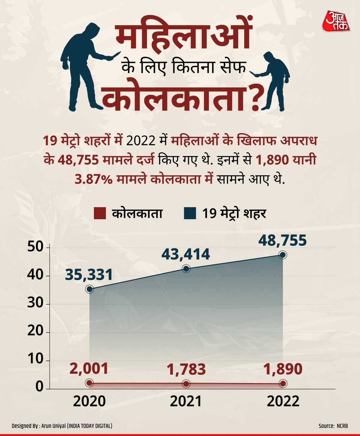 एनसीआरबी के आंकड़े बताते हैं कि 2022 में 19 मेट्रो शहरों में महिलाओं के खिलाफ अपराध के 48,755 मामले दर्ज किए गए थे. 2021 की तुलना में ये आंकड़ा 12.3 फीसदी ज्यादा था.