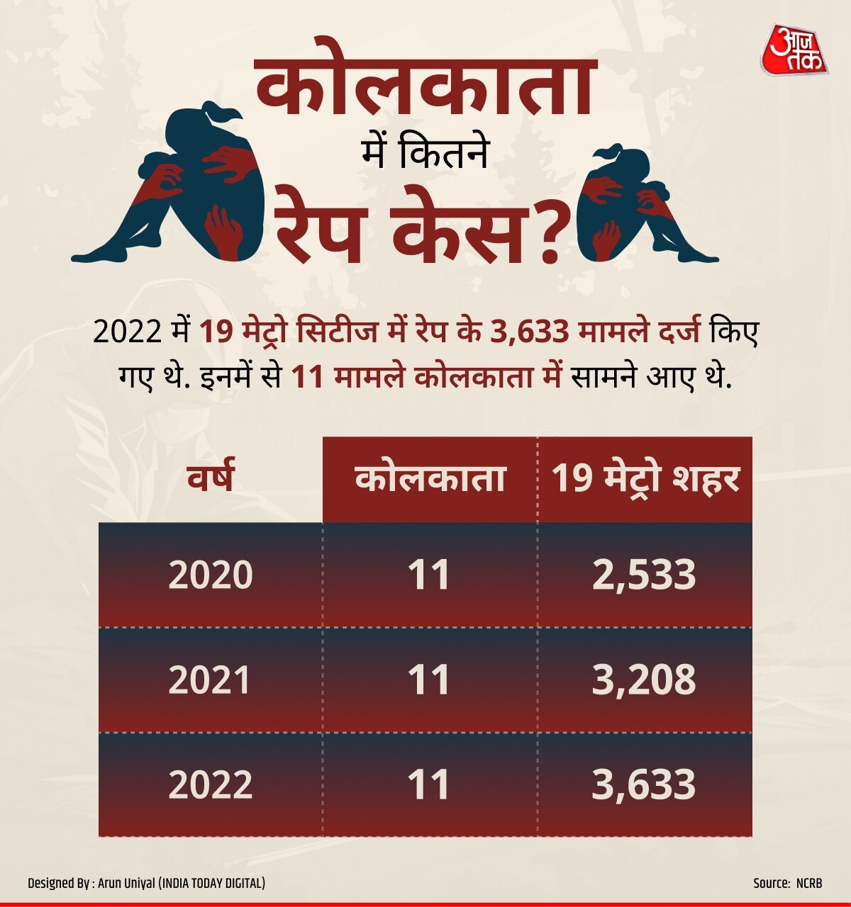 2020 से 2022 के बीच तीन साल में इन 19 मेट्रो शहरों में रेप के 9,374 मामले दर्ज किए गए हैं. इनमें से कोलकाता में 33 मामले दर्ज हुए हैं. तीनों साल कोलकाता में रेप के 11-11 मामले दर्ज किए गए थे.