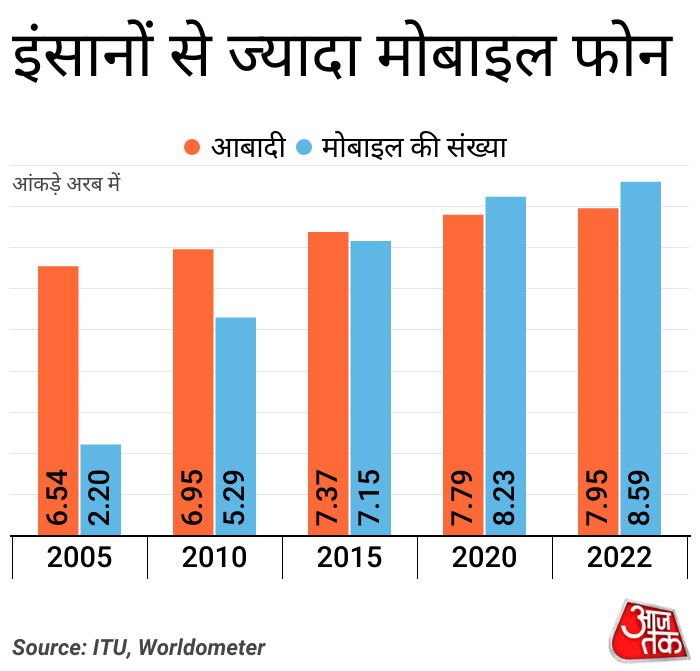 इसके आंकड़े बताते हैं कि 2022 के आखिर तक दुनियाभर में 8.59 अरब मोबाइल फोन थे. जबकि, संयुक्त राष्ट्र के मुताबिक, 2022 तक दुनिया की आबादी 7.95 अरब थी. यानी, इस दुनिया में जितने इंसान नहीं हैं, उससे कहीं ज्यादा तो मोबाइल फोन हैं.