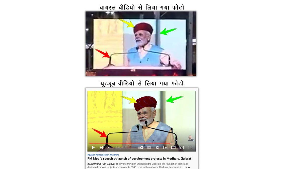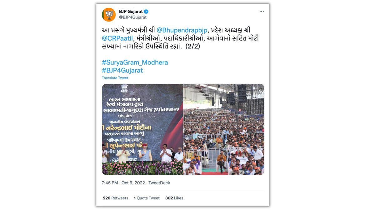 खोजने पर हमें बीजेपी गुजरात का मोढेरा कार्यक्रम से जुड़ा एक ट्वीट भी मिला. इसमें कार्यक्रम के लिए जुटी भीड़ साफ दिख रही है. वायरल वीडियो को ध्यान से देखने पर पता चलता है कि सामने के मुख्य पंडाल के अलावा बगल में और भी पंडाल बनाए गए थे. मुख्य पंडाल तो भरा हुआ था, लेकिन बगल वाला पंडाल खाली था. वायरल वीडियो में दिख रहीं खाली कुर्सियां बगल वाले पंडाल में थीं.