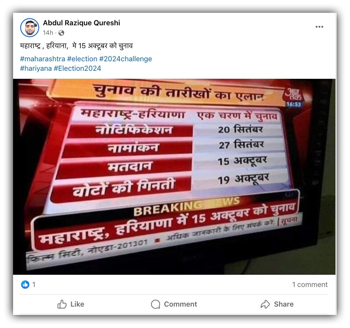 आजतक के लोगो वाली खबर का स्क्रीनशॉट शेयर करते हुए कुछ लोग कह रहे हैं कि महाराष्ट्र और हरियाणा के आगामी विधानसभा चुनाव 15 अक्टूबर को होंगे. देखने में ये किसी न्यूज बुलेटिन का स्क्रीनशॉट लग रहा है. इसमें ऊपर बड़े-बड़े अक्षरों में लिखा है- "चुनाव की तारीखों का ऐलान" और "महाराष्ट्र हरियाणा एक चरण में चुनाव". इसके साथ ही, एक टेबल बना है, जिसमें "मतदान" के आगे "15 अक्टूबर" और "वोटों की गिनती" के आगे "19 अक्टूबर" लिखा है.