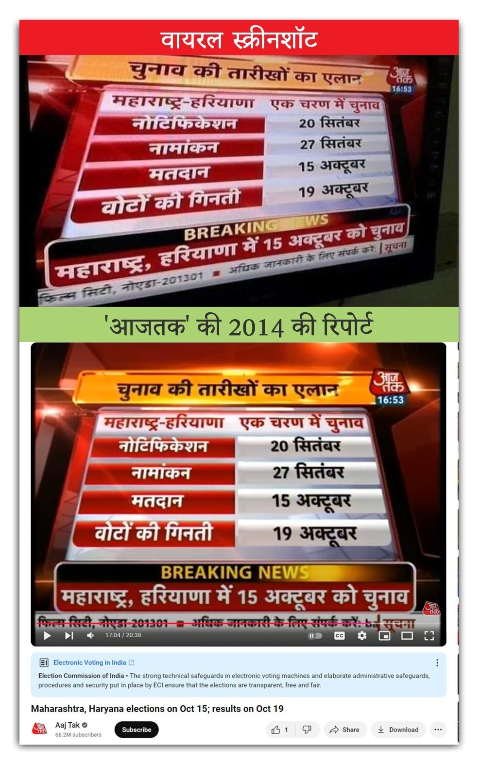 इसके बाद हमने इस स्क्रीनशॉट को रिवर्स सर्च किया. ऐसा करने से हमें 'आजतक' की 12 सितंबर, 2014 की एक रिपोर्ट मिली. इसमें 17 मिनट 4 सेकेंड पर वो हिस्सा देखा जा सकता है, जिसमें वायरल स्क्रीनशॉट वाली सूचनाएं दिख रही हैं. ये रिपोर्ट साल 2014 में हुए महाराष्ट्र और हरियाणा चुनावों के ऐलान से संबंधित है.
