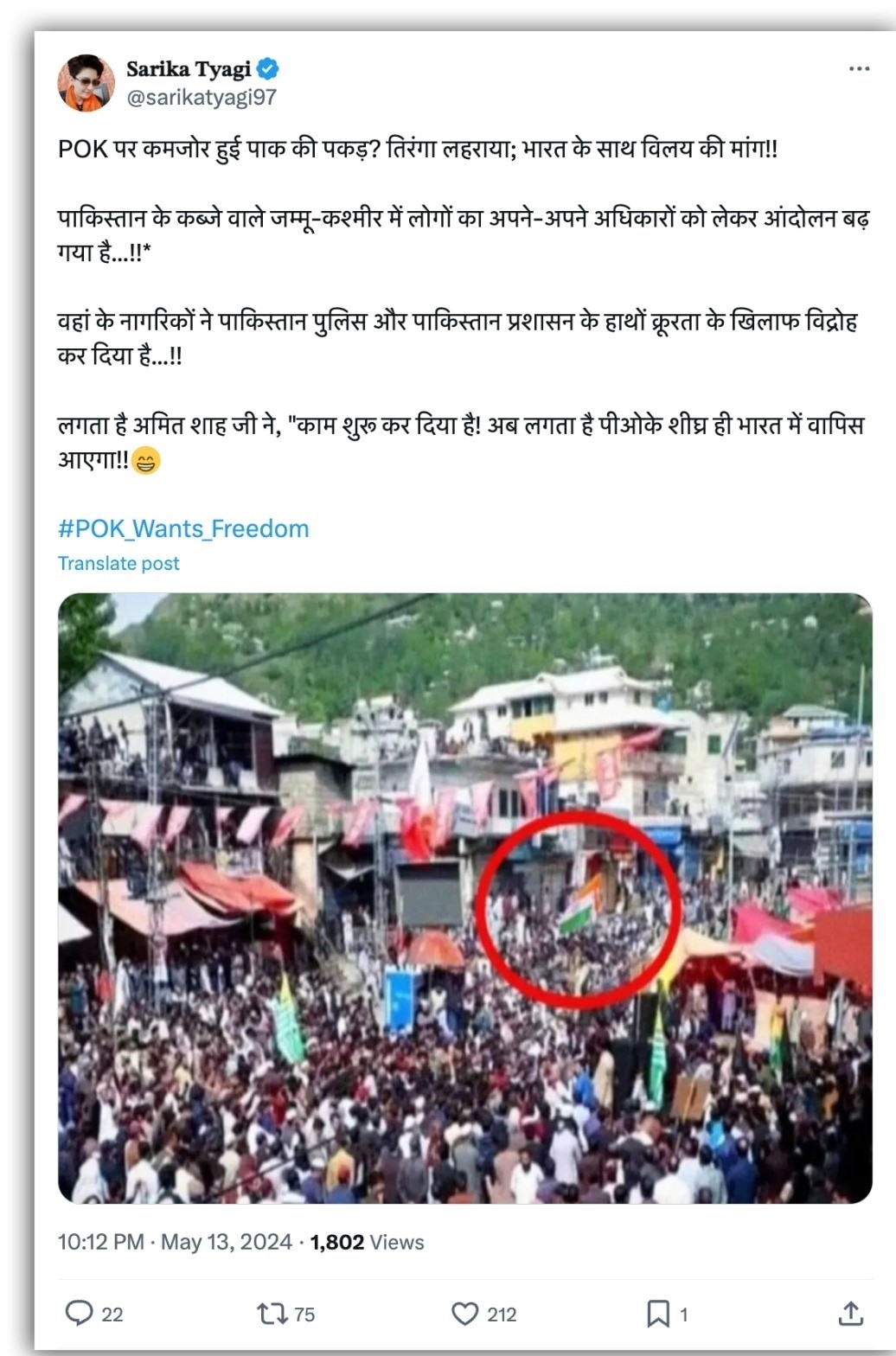 एक एक्स यूजर ने वायरल तस्वीर को शेयर करते हुए लिखा, “POK पर कमजोर हुई पाक की पकड़? तिरंगा लहराया; भारत के साथ विलय की मांग!! पाकिस्तान के कब्जे वाले जम्मू-कश्मीर में लोगों का अपने-अपने अधिकारों को लेकर आंदोलन बढ़ गया है...!!* वहां के नागरिकों ने पाकिस्तान पुलिस और पाकिस्तान प्रशासन के हाथों क्रूरता के खिलाफ विद्रोह कर दिया है...!! लगता है अमित शाह जी ने, "काम शुरू कर दिया है! अब लगता है पीओके शीघ्र ही भारत में वापिस आएगा!!”