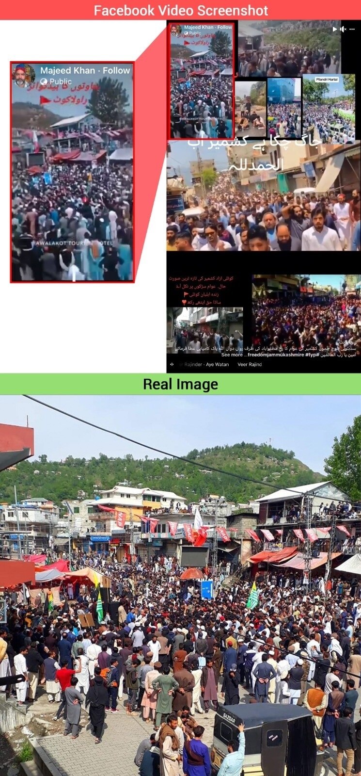 पीओके में जारी प्रदर्शनों को लेकर उर्दू के कीवर्ड्स के जरिये सर्च करने पर हमें 12 मई की एक फेसबुक रील मिली, जिसमें अलग-अलग प्रदर्शनों के वीडियो थे. इसमें ऊपर बाईं तरफ नजर आ रहा वीडियो वायरल तस्वीर से मेल खाता है. इसपर लिखा है, “Rawalakot Tourism Hotel”. रावलाकोट पीओके के पुंछ की राजधानी है. फेसबुक वीडियो और वायरल तस्वीर की तुलना से पता चल जाता है कि दोनों लोकेशन एक ही हैं.