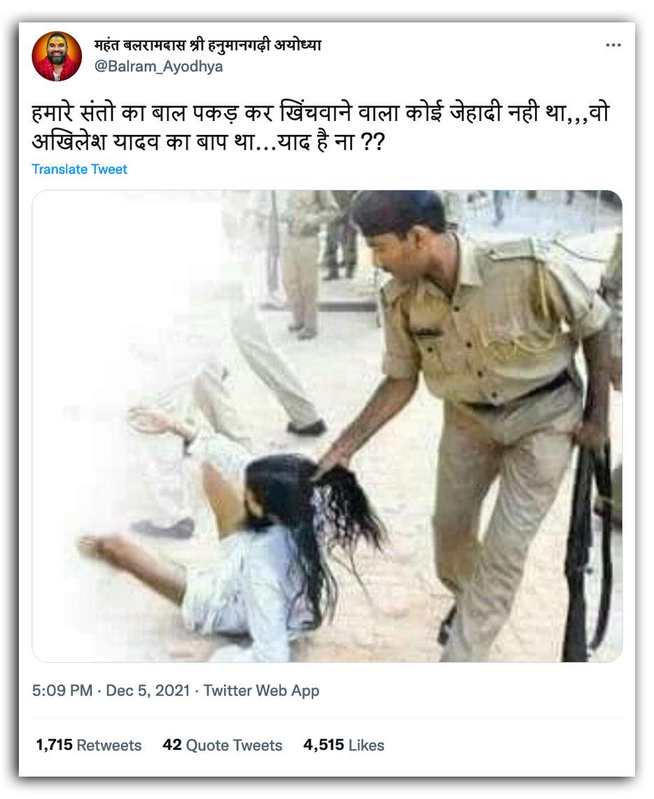 तस्वीर के साथ एक ट्विटर यूजर ने कैप्शन में लिखा, "हमारे संतो का बाल पकड़ कर खिंचवाने वाला कोई जेहादी नही था,,,वो अखिलेश यादव का बाप था...याद है ना ??". इसी कैप्शन के साथ तस्वीर को फेसबुक और ट्विटर पर कई लोग शेयर कर चुके हैं.