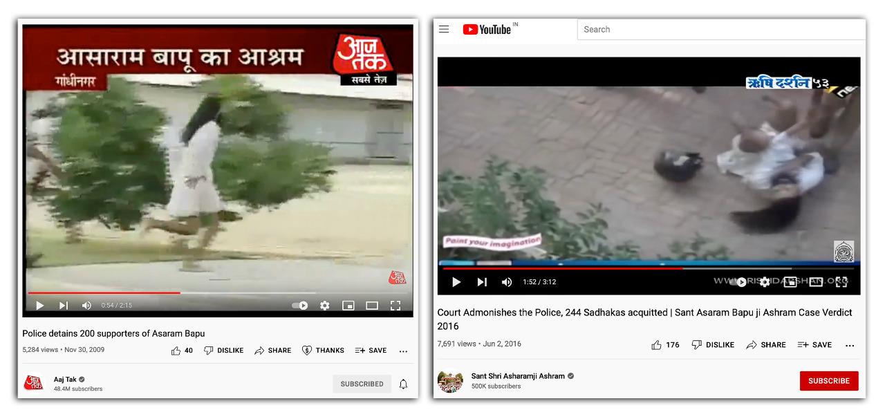 खोजने पर हमें इस घटना को लेकर उस समय की कुछ वीडियो रिपोर्ट्स भी मिलीं. ये वीडियो 'आजतक' और आसाराम के आधिकारिक यूट्यूब चैनल पर मौजूद हैं. इन वीडियोज में भी वायरल फोटो जैसे लंबे बाल वाले एक व्यक्ति को देखा जा सकता है जिसे पुलिस खदेड़ रही है.