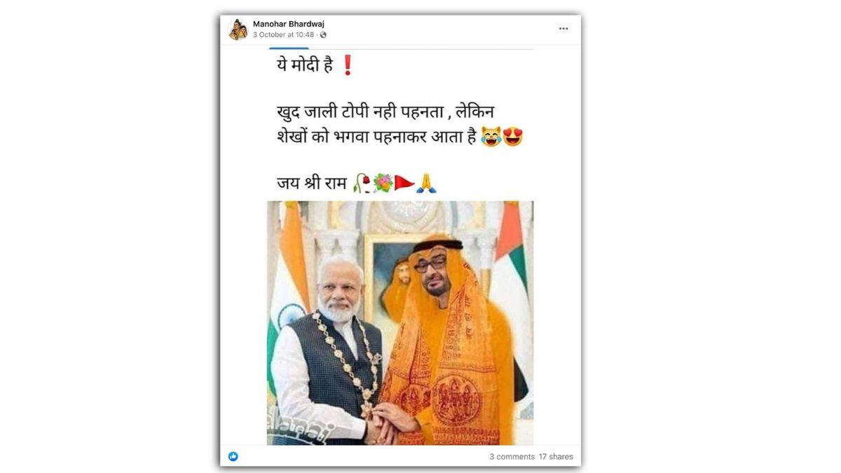 इस तस्वीर को शेयर करते हुए कुछ लोग कह रहे हैं कि मोदी ने एक शेख को भी भगवा कपड़े पहना दिए. इस तस्वीर के साथ लिखा है, “ ये मोदी है खुद जाली टोपी नही पहनता लेकिन शेखों को भगवा पहनाकर आता है.”
