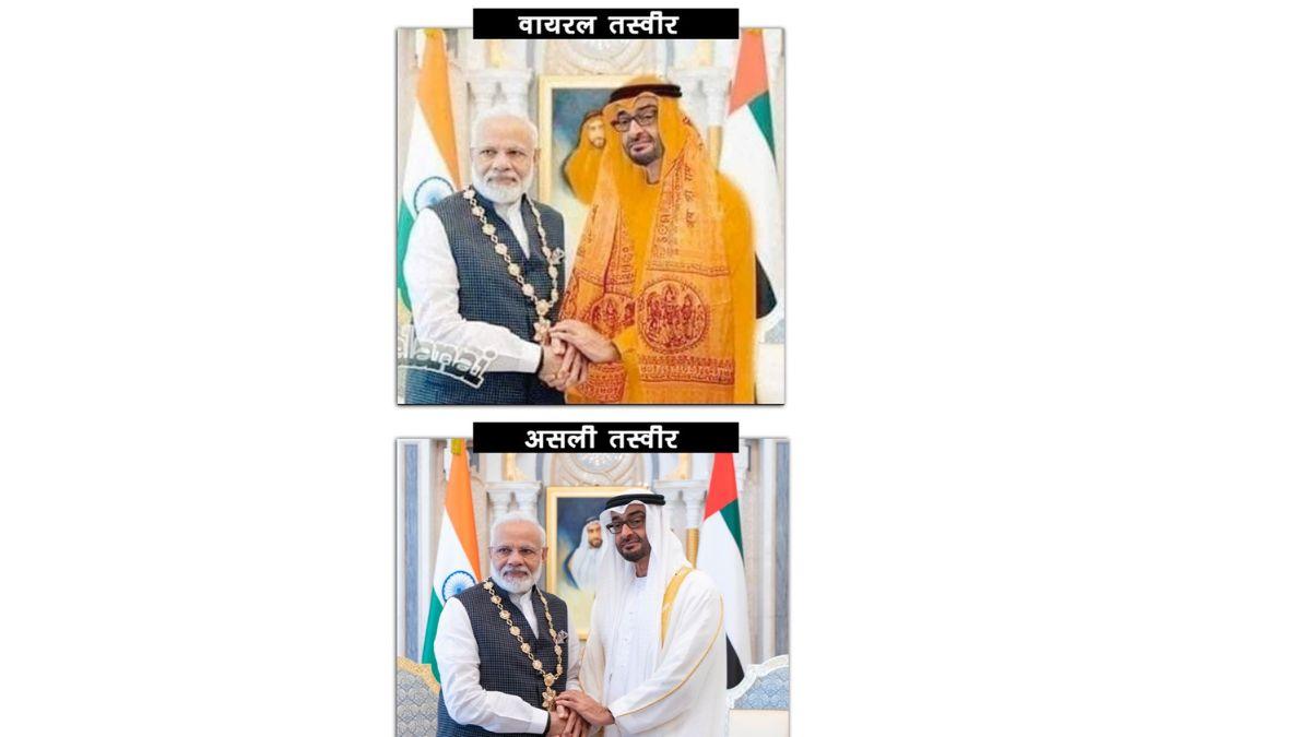 साल 2019 में मोदी को यूएई के सर्वोच्च नागरिक सम्मान ‘ Order of Zayed’ से सम्मानित किया गया था. ये खबर उस वक्त की कई मीडिया रिपोर्ट्स में भी है. मोहम्मद बिन जायद उस वक्त यूएई के क्राउन प्रिंस थे और ये तस्वीर तभी ली गई थी जिसे एडिट करके अब वायरल किया जा रहा है.