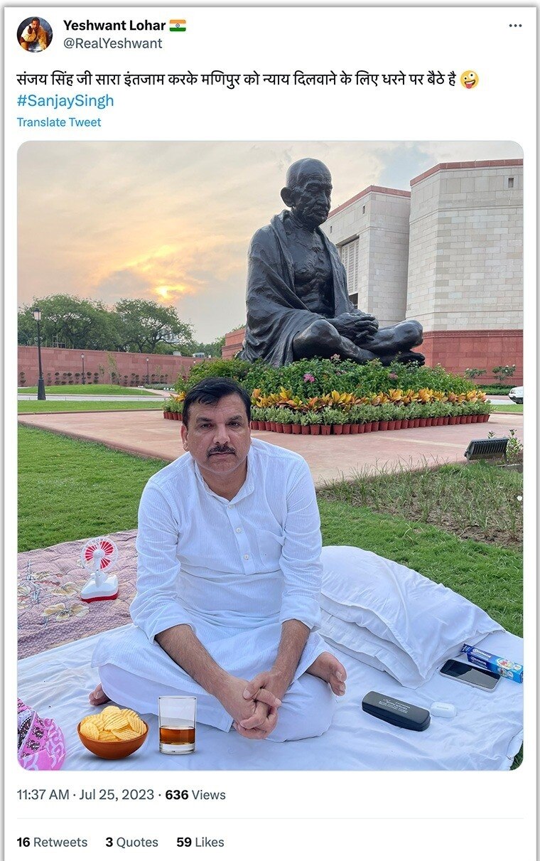 इस तस्वीर को शेयर करते हुए एक ट्विटर यूजर ने लिखा, "संजय सिंह जी सारा इंतजाम करके मणिपुर को न्याय दिलवाने के लिए धरने पर बैठे हैं." इस ट्वीट का आर्काइव्ड वर्जन यहां देखा जा सकता है.