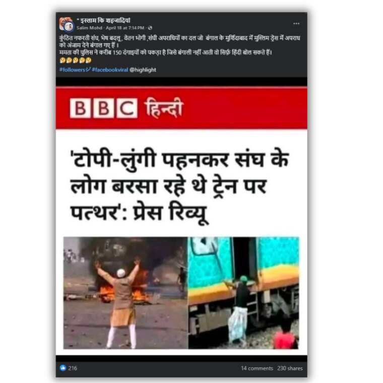 खबर की हेडलाइन है- "टोपी-लुंगी पहनकर संघ के लोग बरसा रहे थे ट्रेन पर पत्थर': प्रेस रिव्यू". इसमें बीबीसी का लोगो लगा है और दो तस्वीरें भी हैं. पहली तस्वीर में एक मुस्लिम टोपी पहने हुए व्यक्ति जलते हुए वाहन के सामने बाहें फैला कर खड़ा है. वहीं, दूसरी फोटो में एक सफेद टोपी वाला शख्स लाठी से ट्रेन का शीशा तोड़ता नजर आ रहा है.