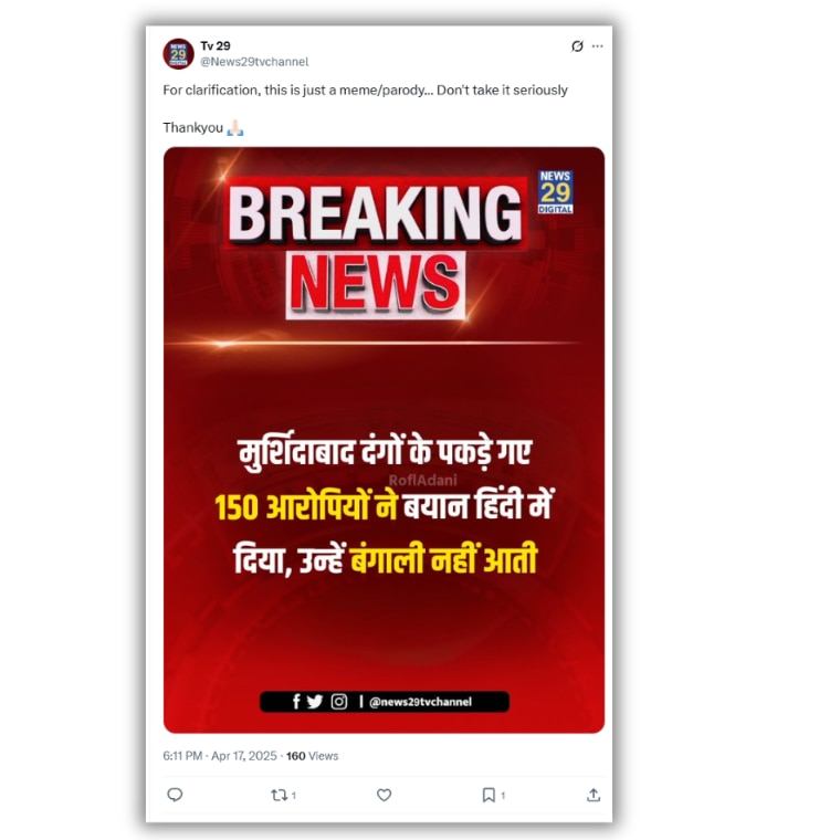 हमें Tv 29 नाम के एक पैरोडी एक्स अकाउंट का पोस्ट मिला जिसमें स्पष्टीकरण दिया गया है कि ये सिर्फ एक मजाक था.