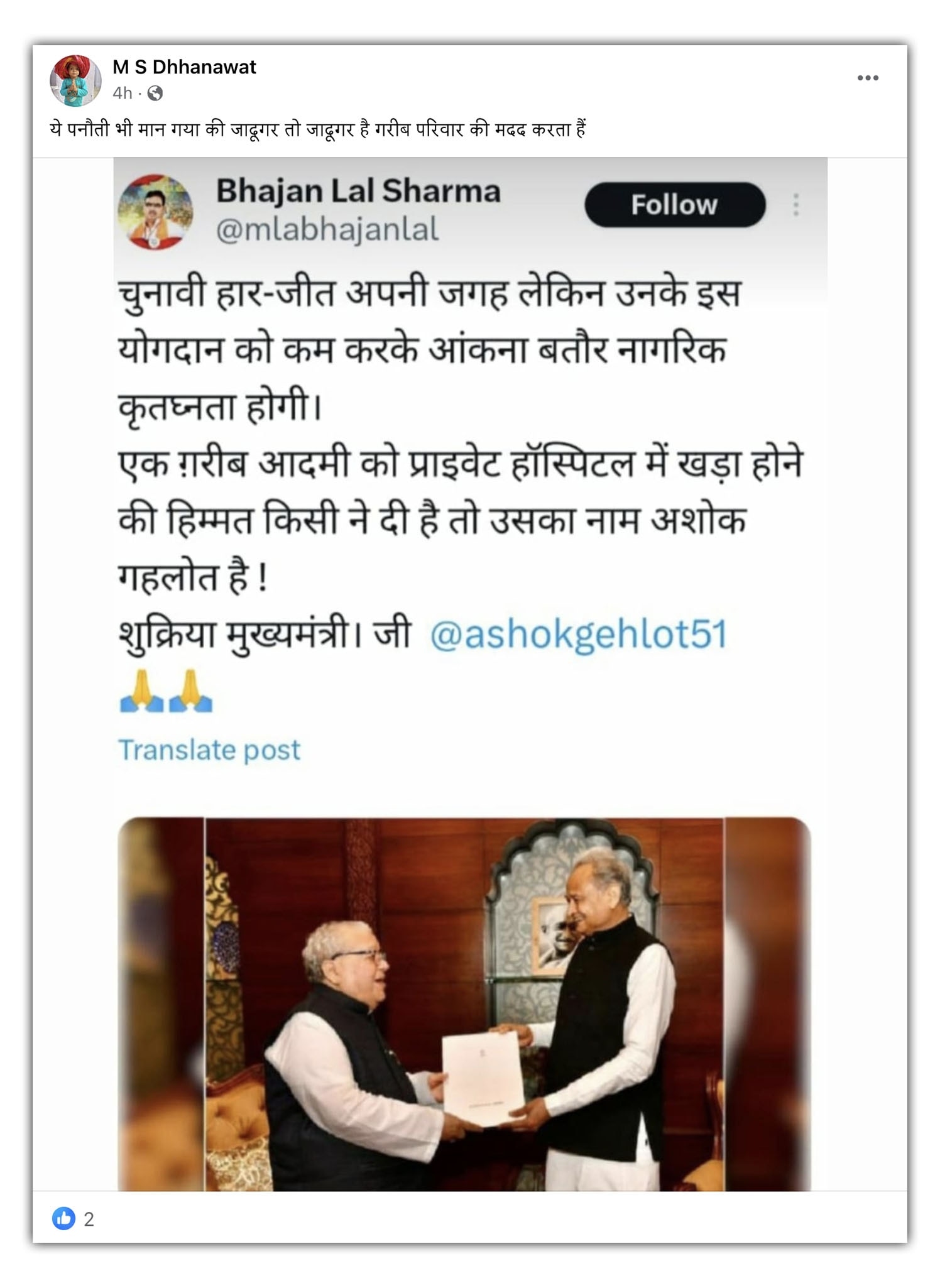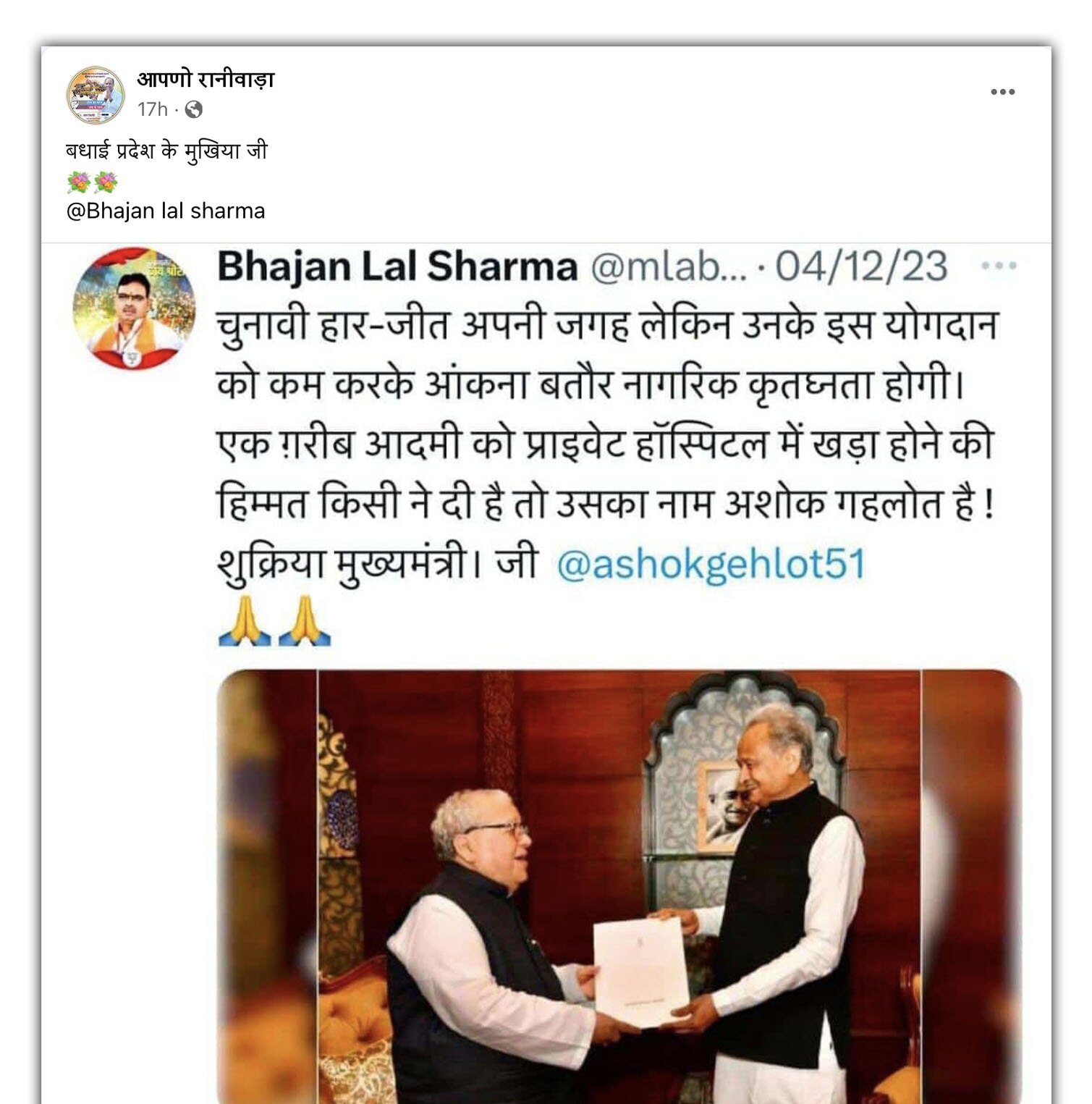 ऐसा कहने वाले लोग भजनलाल का ट्वीट बताते हुए एक स्क्रीनशॉट शेयर कर रहे हैं. '@mlabhajanlal' नामक एक्स (पहले ट्विटर) अकाउंट से किए गए इस कथित ट्वीट में लिखा है, "चुनावी हार-जीत अपनी जगह लेकिन उनके इस योगदान को कम करके आंकना बतौर नागरिक कृतघ्नता होगी. एक गरीब आदमी को प्राइवेट हॉस्पिटल में खड़ा होने की हिम्मत किसी ने दी है तो उसका नाम अशोक गहलोत है. शुक्रिया मुख्यमंत्री जी." साथ ही पोस्ट में राज्यपाल कलराज मिश्र को इस्तीफा सौंपते गहलोत की एक तस्वीर भी है.