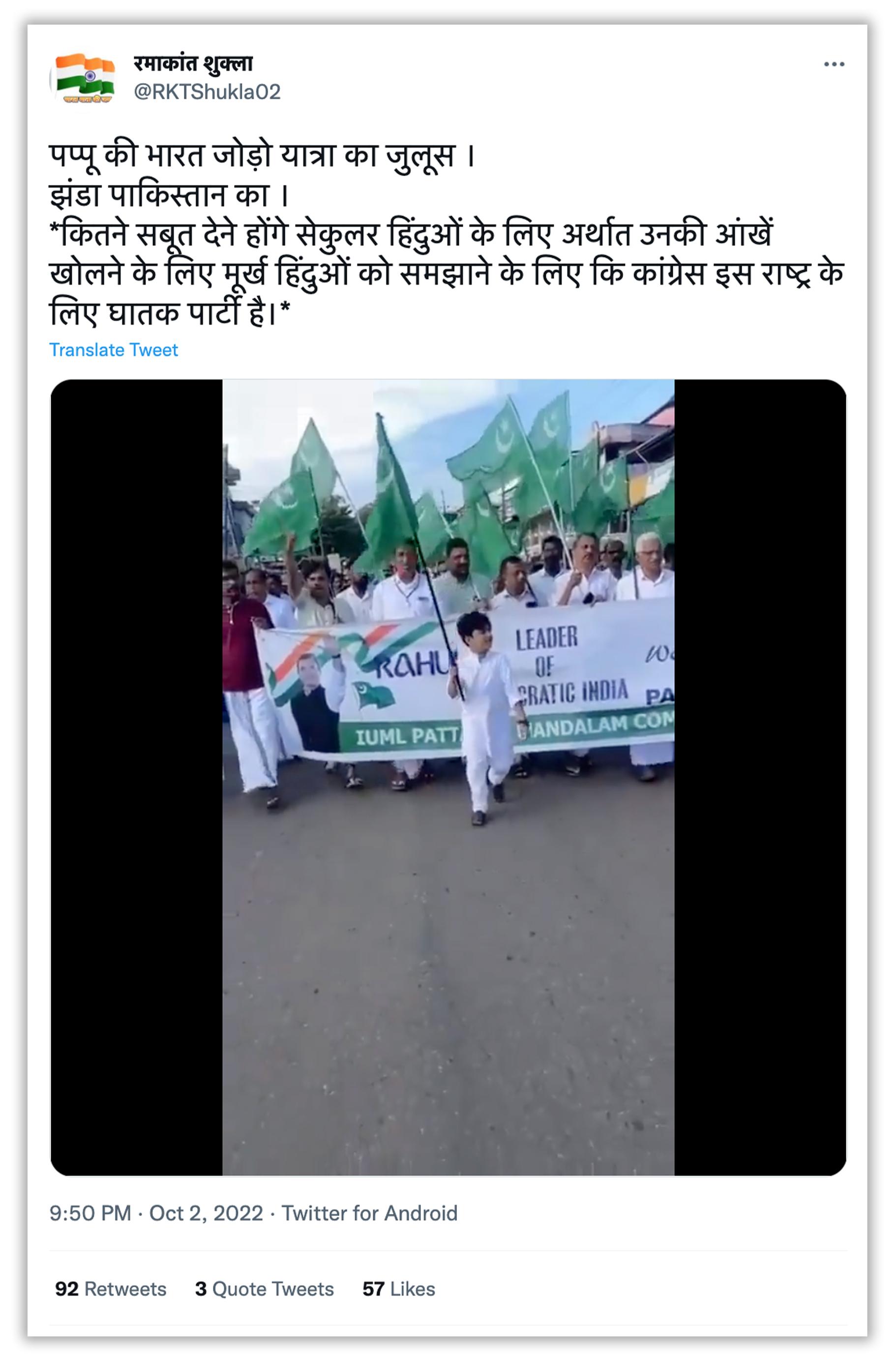 इस वीडियो को शेयर करते हुए एक ट्विटर यूजर ने लिखा, “पप्पू की भारत जोड़ो यात्रा का जुलूस. झंडा पाकिस्तान का. कितने सबूत देने होंगे सेकुलर हिंदुओं के लिए अर्थात उनकी आंखें खोलने के लिए मूर्ख हिंदुओं को समझाने के लिए कि कांग्रेस इस राष्ट्र के लिए घातक पार्टी है.”