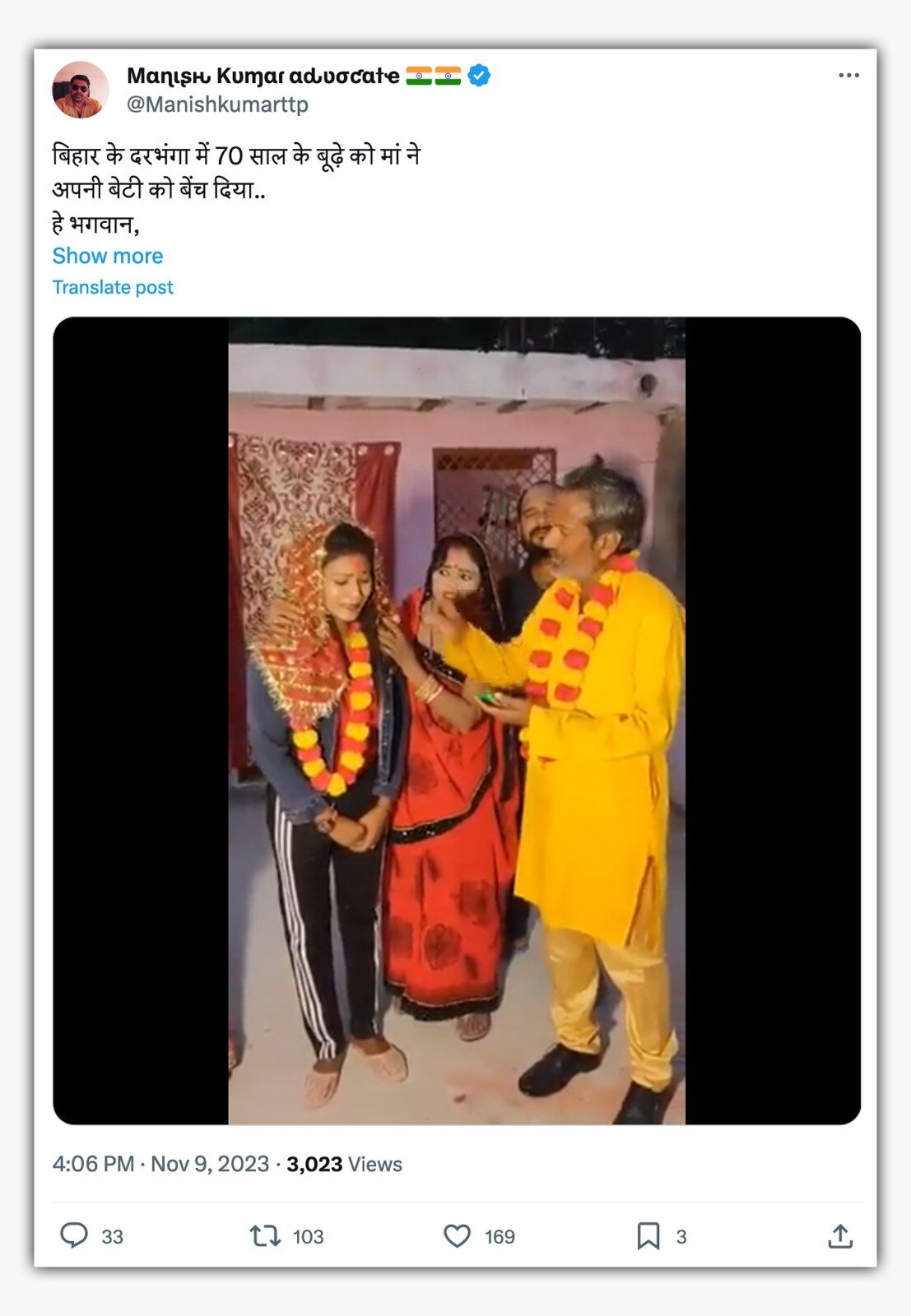 वीडियो शेयर करने वालों की मानें तो ये घटना बिहार के दरभंगा शहर की है, जहां एक महिला ने 70 साल के बूढ़े शख्स को अपनी बेटी बेच दी. वीडियो शेयर करते हुए एक फेसबुक यूजर ने लिखा, "बिहार के दरभंगा में 70 साल के बूढ़े को मां ने अपनी बेटी को बेंच दिया."