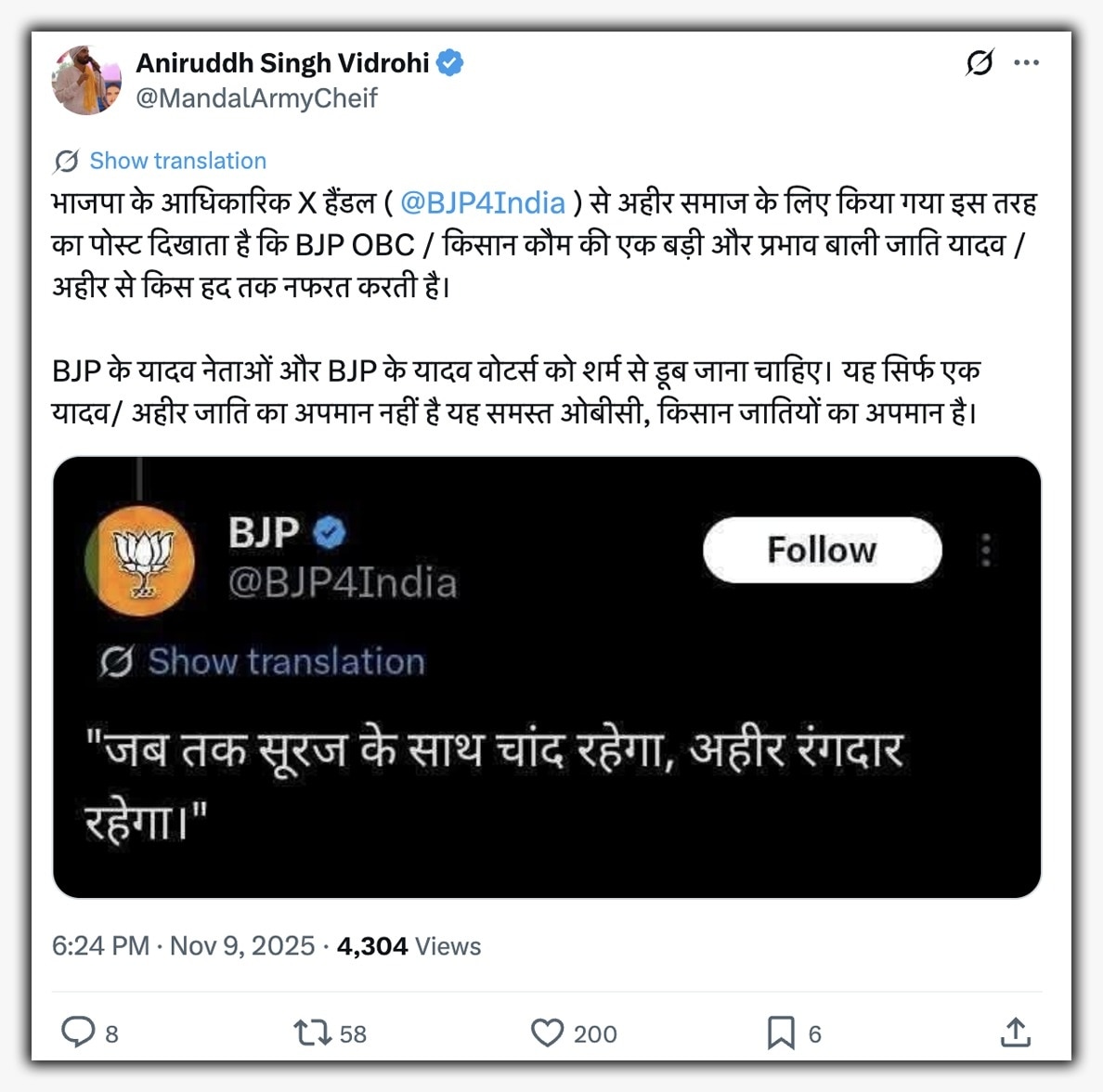इसे शेयर करते हुए कई लोग कह रहे हैं कि बीजेपी ने यादव समाज का अपमान किया है. मिसाल के तौर पर, एक एक्स यूजर ने लिखा, “भाजपा के आधिकारिक X हैंडल (@BJP4India) से अहीर समाज के लिए किया गया इस तरह का पोस्ट दिखाता है कि BJP OBC / किसान कौम की एक बड़ी और प्रभाव बाली जाति यादव / अहीर से किस हद तक नफरत करती है. BJP के यादव नेताओं और BJP के यादव वोटर्स को शर्म से डूब जाना चाहिए. यह सिर्फ एक यादव/ अहीर जाति का अपमान नहीं है यह समस्त ओबीसी, किसान जातियों का अपमान है.”