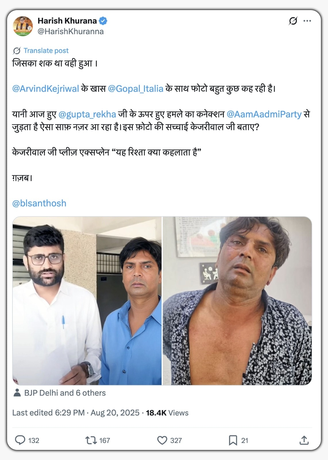 खुराना ने फोटो के साथ लिखा है, “जिसका शक था वही हुआ अरविंद केजरीवाल के खास गोपाल इटालिया के साथ फोटो बहुत कुछ कह रही है. यानी आज हुए रेखा गुप्ता के ऊपर हुए हमले का कनेक्शन आम आदमी पार्टी से जुड़ता है ऐसा साफ़ नज़र आ रहा है. इस फ़ोटो की सच्चाई केजरीवाल जी बताए? केजरीवाल जी प्लीज़ एक्सप्लेन “यह रिश्ता क्या कहलाता है” ग़ज़ब.”.