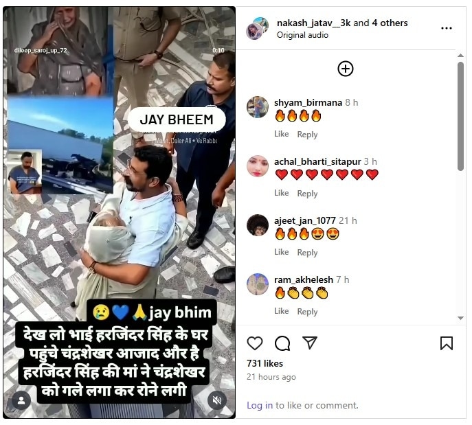 वायरल वीडियो पर लिखा है, “देख लो भाई हरजिंदर सिंह के घर पहुंचे चंद्रशेखर आजाद और है. हरजिंदर सिंह की मां ने चंद्रशेखर को गले लगा कर रोने लगी.”