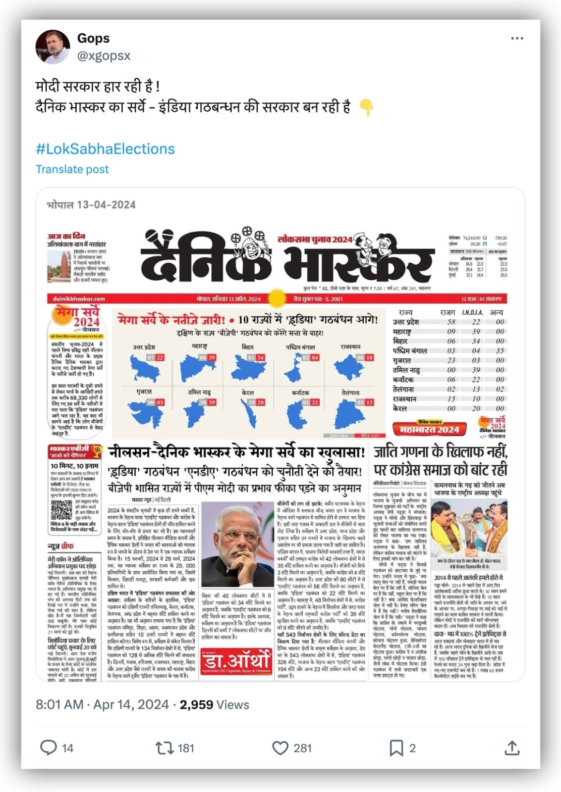 लोकसभा चुनाव 2024 के पहले चरण का मतदान 19 अप्रैल को होने वाला है. इस बीच सोशल मीडिया पर दैनिक भास्कर के एक कथित चुनावी सर्वे का स्क्रीनशॉट सोशल मीडिया पर खूब वायरल हो रहा है. ऐसा कहा जा रहा है कि 13 अप्रैल को दैनिक भास्कर में छपे इस सर्वे के मुताबिक विपक्षी दलों के I.N.D.I.A गठबंधन को 10 राज्यों में बढ़त मिलने का अनुमान है. वहीं दक्षिण भारत के राज्यों के नतीजों के बाद वहां एनडीए का सफाया होने का दावा भी किया गया है.