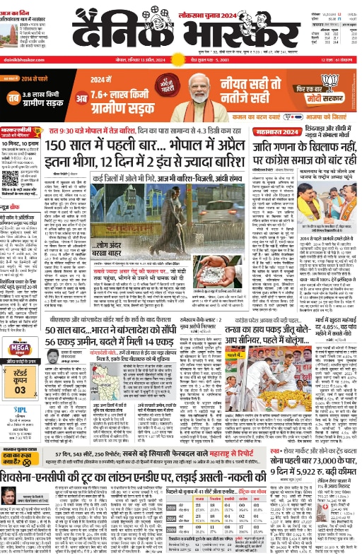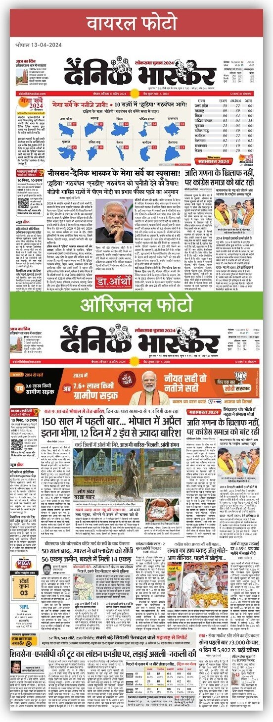 इस तस्वीर में देखा जा सकता है कि 13 अप्रैल को कोई चुनावी सर्वे रिपोर्ट नहीं छापी गई थी. इस दिन पहले पन्ने पर बीजेपी के एक विज्ञापन और भोपाल की बारिश से जुड़ी खबर को देखा जा सकता है. हमने दैनिक भास्कर के अन्य सभी शहरों से छपने वाले एडीशन को देखा मगर उनमें भी I.N.D.I.A. गठबंधन की बढ़त का अनुमान लगाता कोई सर्वे नहीं छापा गया है. ये बात तो यहीं साफ हो जाती है कि वायरल स्क्रीनशॉट को एडिट किया गया है.