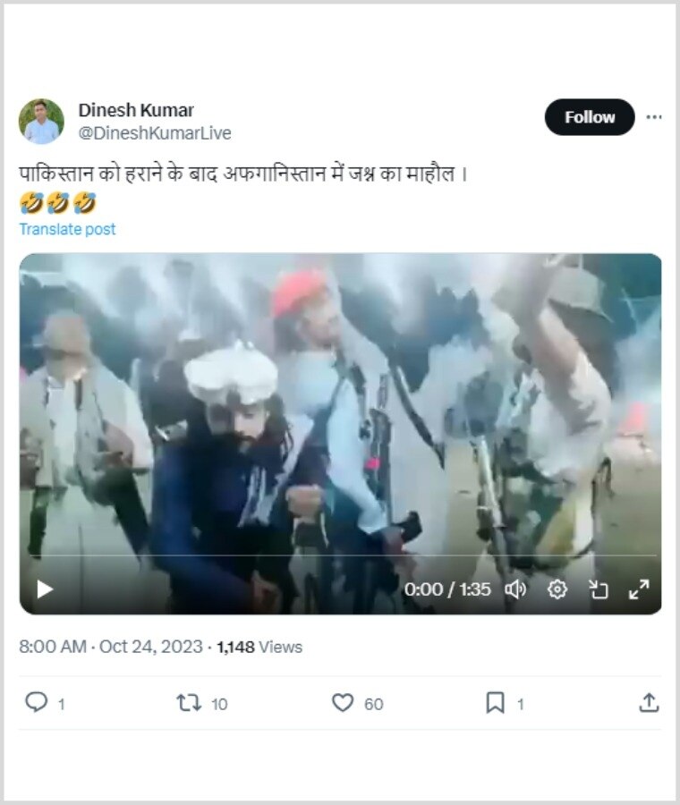 इस वीडियो को शेयर करते हुए एक ट्विटर यूजर ने लिखा, “पाकिस्तान को हराने के बाद अफगानिस्तान में जश्न का माहौल”. एक अन्य ट्विटर यूजर ने लिखा, “जीत का जश्न”.