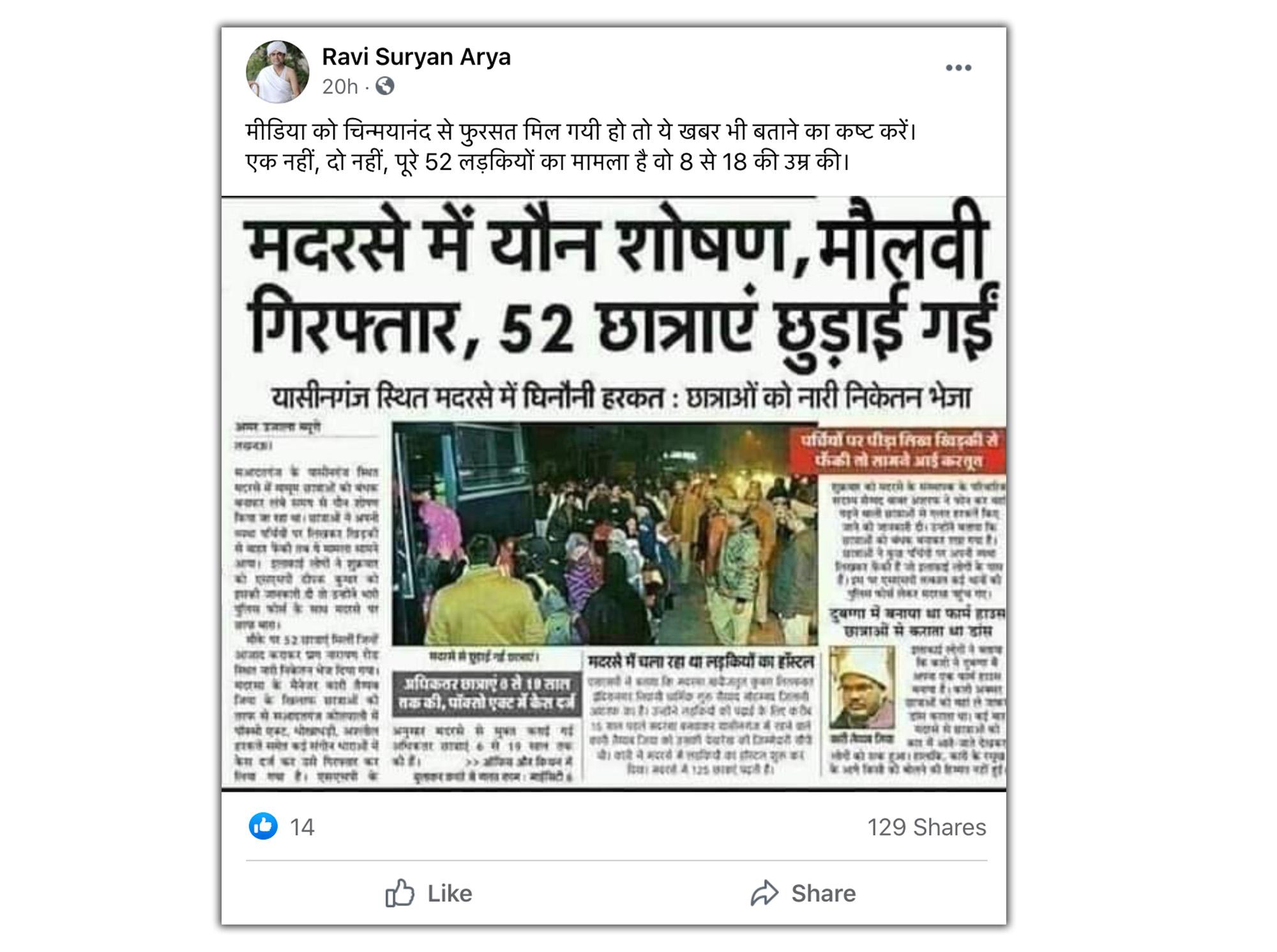 क्लिपिंग को शेयर करते हुए एक फेसबुक यूजर ने कैप्शन में लिखा है "मीडिया को चिन्मयानंद से फुरसत मिल गयी हो तो ये खबर भी बताने का कष्ट करें. एक नहीं, दो नहीं, पूरे 52 लड़कियों का मामला है वो 8 से 18 की उम्र की". इसी तरह के कुछ अन्य कैप्शन के साथ ये तस्वीर फेसबुक पर घूम रही है. खबर को इस तरह से पेश किया जा रहा है जैसे ये हाल फिलहाल की घटना हो.