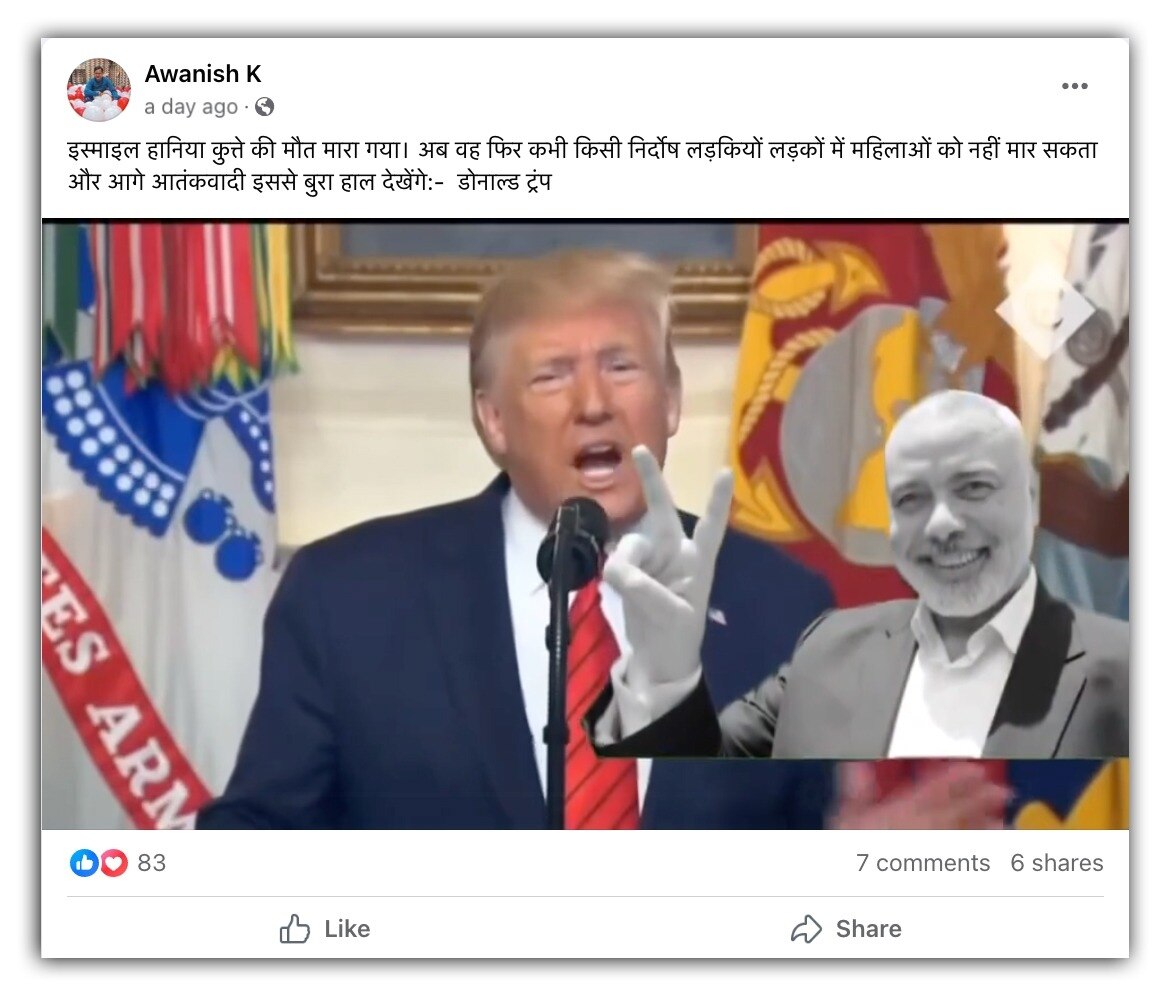 वायरल वीडियो को पोस्ट करते हुए एक फेसबुक यूजर ने लिखा, “इस्माइल हानिया कुत्ते की मौत मारा गया. अब वह फिर कभी किसी निर्दोष लड़कियों लड़कों में महिलाओं को नहीं मार सकता और आगे आतंकवादी इससे बुरा हाल देखेंगे:- डोनाल्ड ट्रंप.” इस पोस्ट का आर्काइव्ड वर्जन यहां देखा जा सकता है.