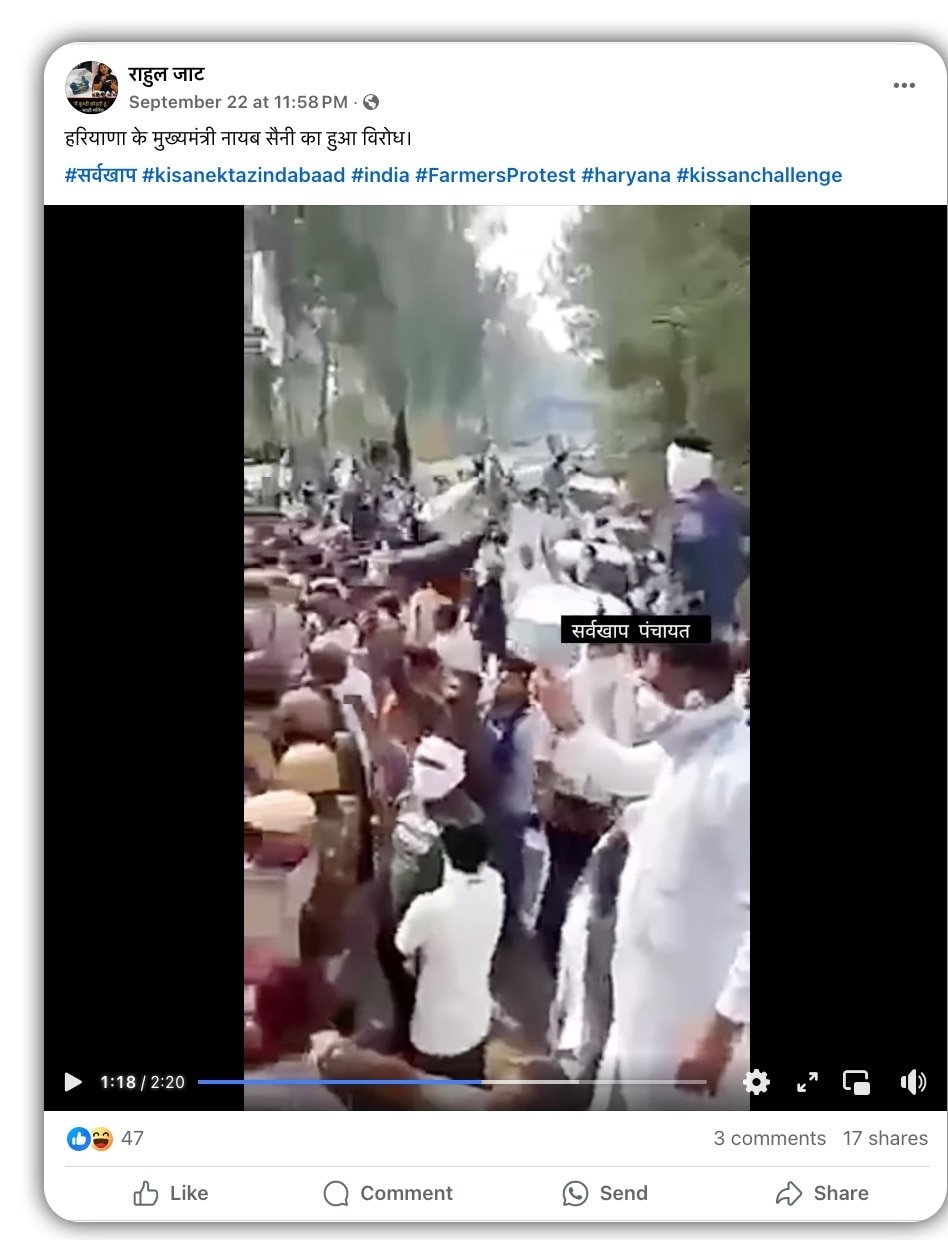 फेसबुक पोस्ट में दी गई जानकारी के अनुसार, ये वीडियो अंबाला जिले के नारायणगढ़ का है, जहां उस समय किसान तीन कृषि कानूनों का विरोध कर रहे थे. और इस दौरान किसानों ने बीजेपी सांसद रतलाल कटारिया और नायब सिंह सैनी के खिलाफ काले झंडे दिखाकर प्रदर्शन किया था.