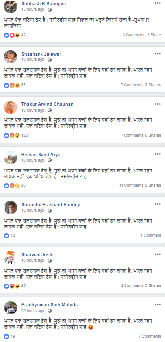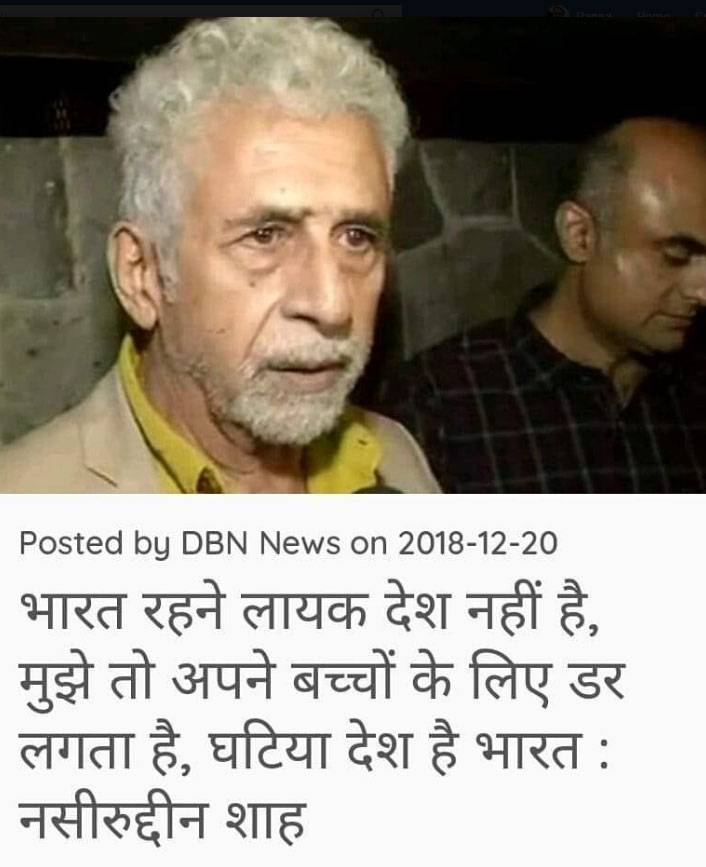 सीनियर एक्टर नसीरुद्दीन शाह ने असहिष्णुता की बहस को अपने बयान से एक बार फिर सुर्खियों में ला दी है. शाह ने इस बयान में कहा है कि समाज साम्प्रदायिक आधार पर इतना बंट गया है कि उन्हें अपने बच्चों को लेकर डर लगता है. हालांकि कई लोग उनके बयान की प्रमाणिकता को लेकर बहस कर रहे हैं. वहीं कई लोगों का कहना है कि उनके बयान को तोड़-मरोड़ कर पेश किया जा रहा है जिससे उनकी छवि को धूमिल किया जा सके. लोग नसीरुद्दीन शाह के हवाले से ऐसे ऐसे बयानों का ज़िक्र कर रहे हैं जो उन्होंने कभी दिए ही नहीं. दावों के मुताबिक नसीरुद्दीन शाह ने ये भी कहा कि "भारत एक घटिया देश है, रहने लायक नहीं है."