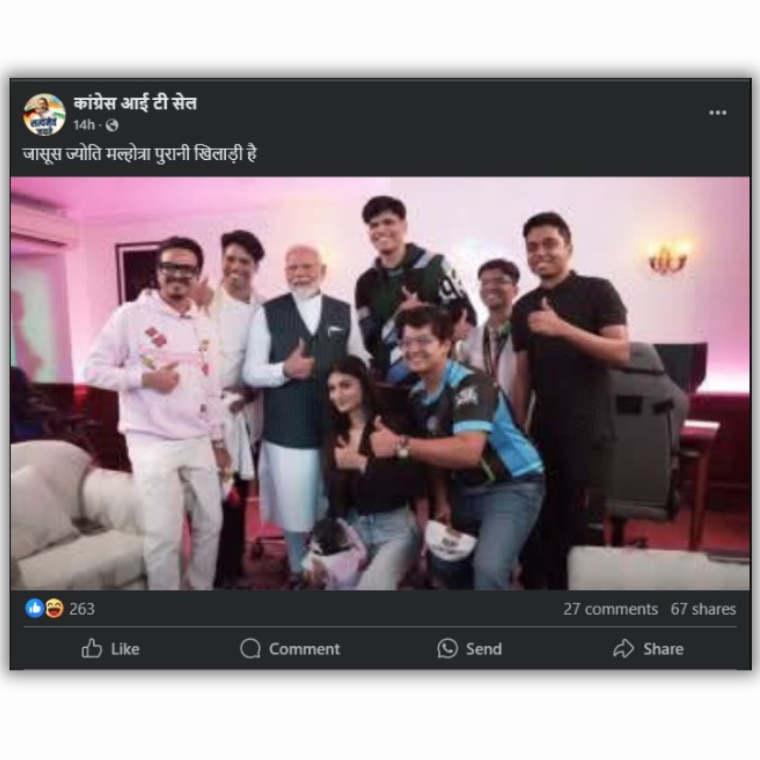 इस फोटो को शेयर करते हुए एक फेसबुक यूजर ने लिखा, "पाकिस्तानी जासूस ज्योति मल्होत्रा पुरानी खिलाड़ी है और साहेब का सरक्षण भी प्राप्त है".
