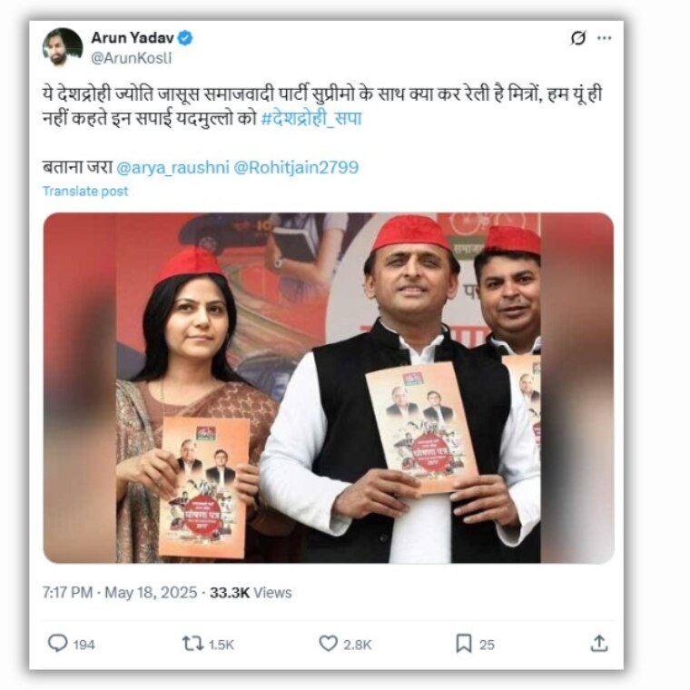 एक एक्स यूजर ने इसे शेयर करते हुए लिखा, "ये देशद्रोही ज्योति जासूस समाजवादी पार्टी सुप्रीमो के साथ क्या कर रेली है मित्रों, हम यूं ही नहीं कहते इन सपाई यदमुल्लो को #देशद्रोही_सपा"