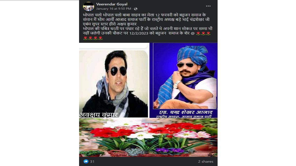 ऐसा कहने वाले लोग एक वीडियो पोस्टर शेयर कर रहे हैं जिसमें अक्षय कुमार हाथ जोड़े खड़े हैं. साथ ही, भीम आर्मी चीफ चंद्रशेखर आजाद रावण की भी तस्वीर लगी है. पोस्टर पर लिखा है "फिल्म नेता अक्षय कुमार” और नीचे लिखा है, “मैं आ रहा हूं, आरक्षण के समर्थन में, चलो भोपाल आरक्षण जिंदाबाद, 12 फरवरी भोपाल, हक की लड़ाई लड़ने के लिए सोचो मत आओ." वीडियो में एक गाना भी बज रहा है.