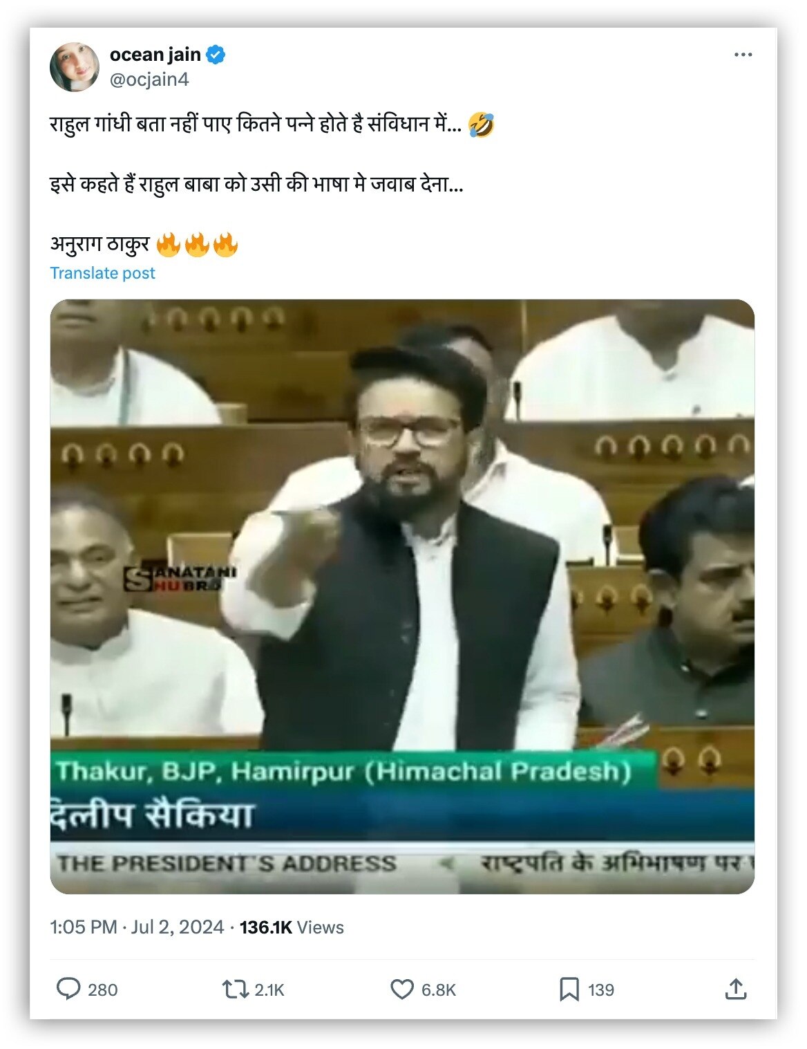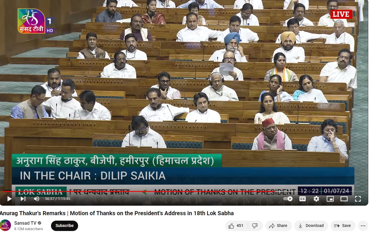 कीवर्ड सर्च की मदद से खोजने पर हमने पाया कि अनुराग ठाकुर ने संविधान वाला सवाल लोकसभा में राष्ट्रपति के अभिभाषण पर बोलते हुए पूछा था. उन्होंने लोकसभा में 1 जुलाई 2024 को ये भाषण दिया था.